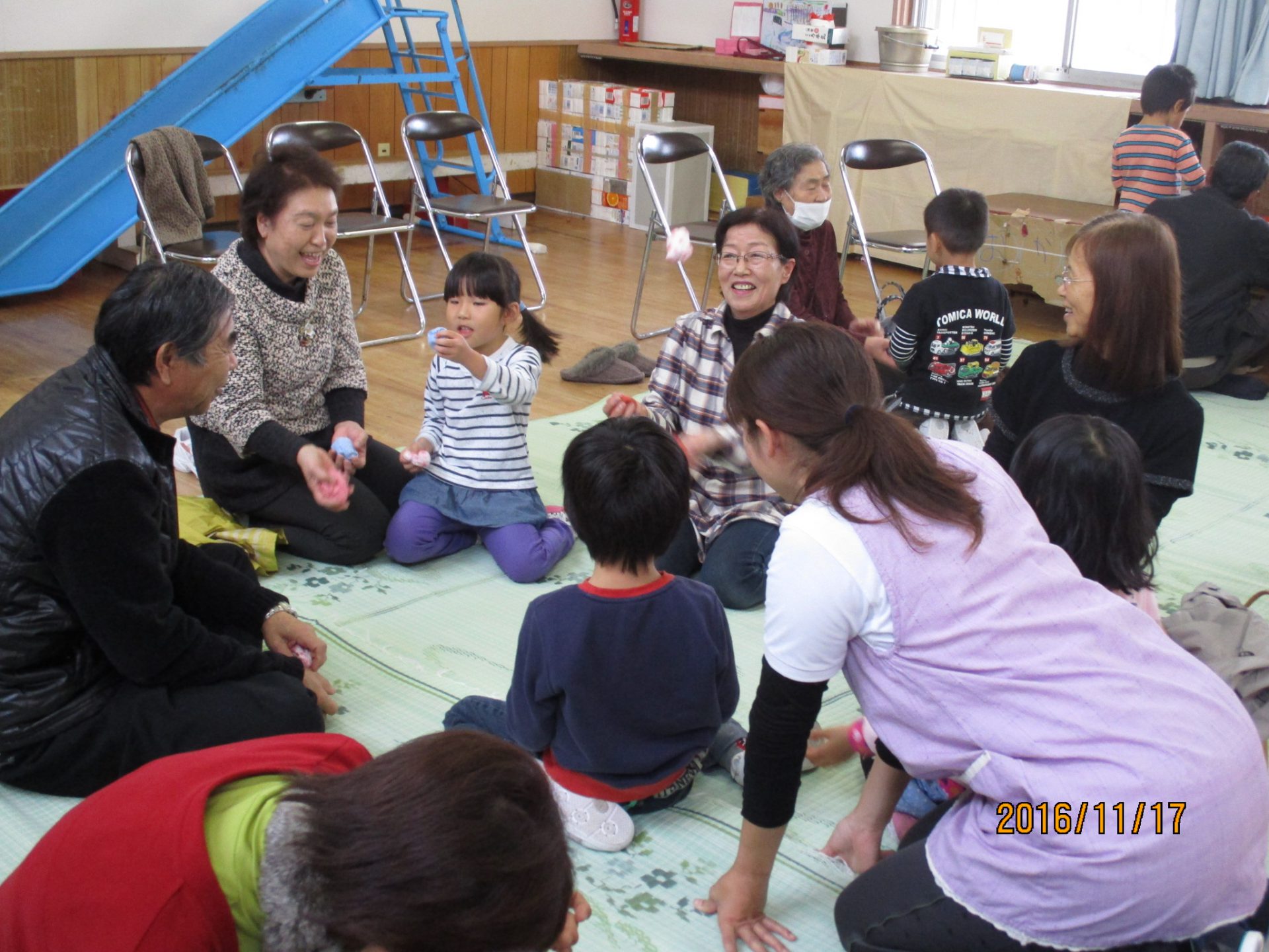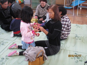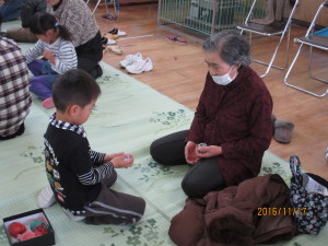 お手玉やあやとり、どんぐりごまなど世代を超えて共通の遊びを楽しみ、おじいちゃんおばあちゃんをより身近に感じ、伝承遊びにも興味や関心を持つことができた一日になりました。
