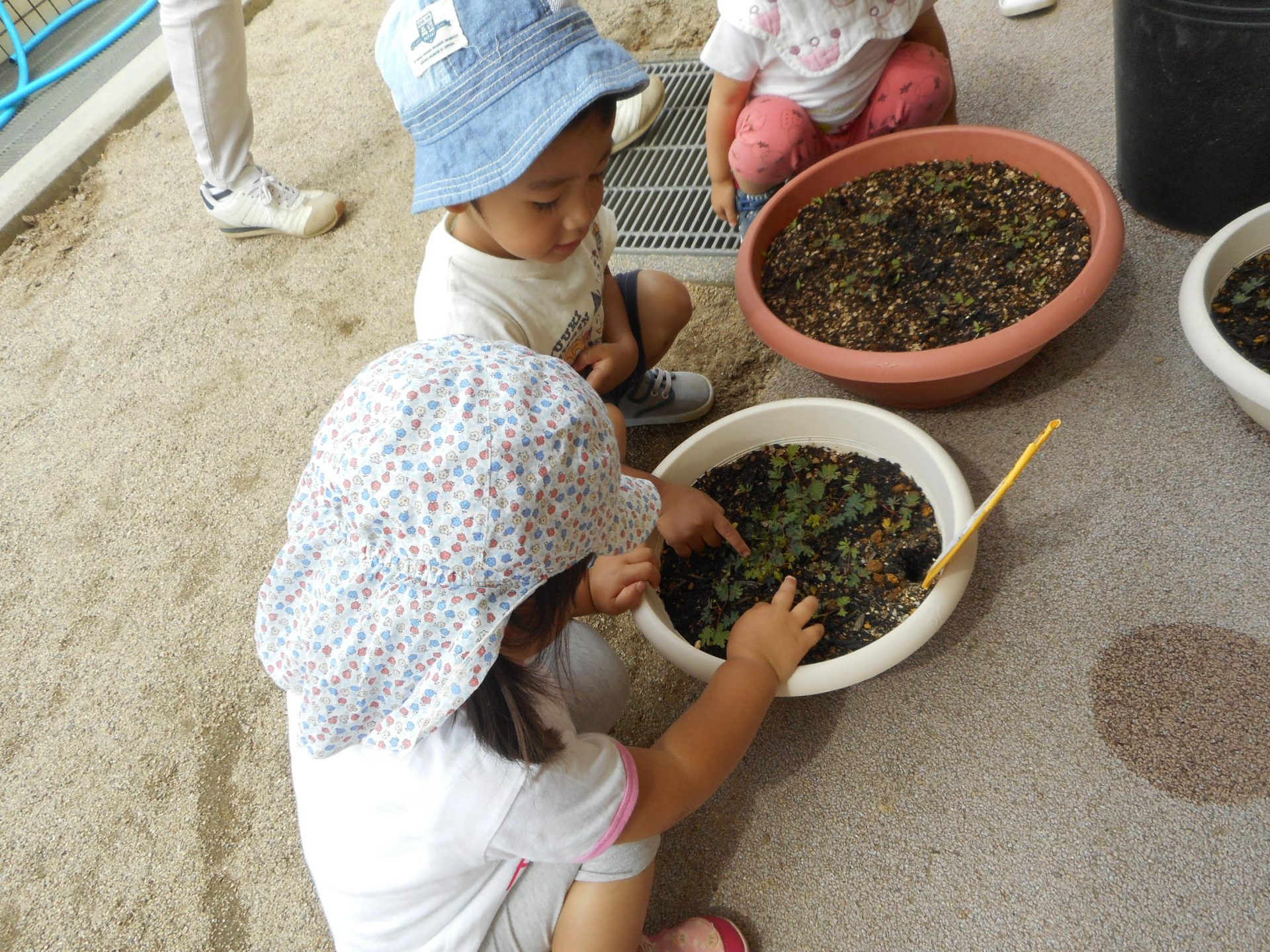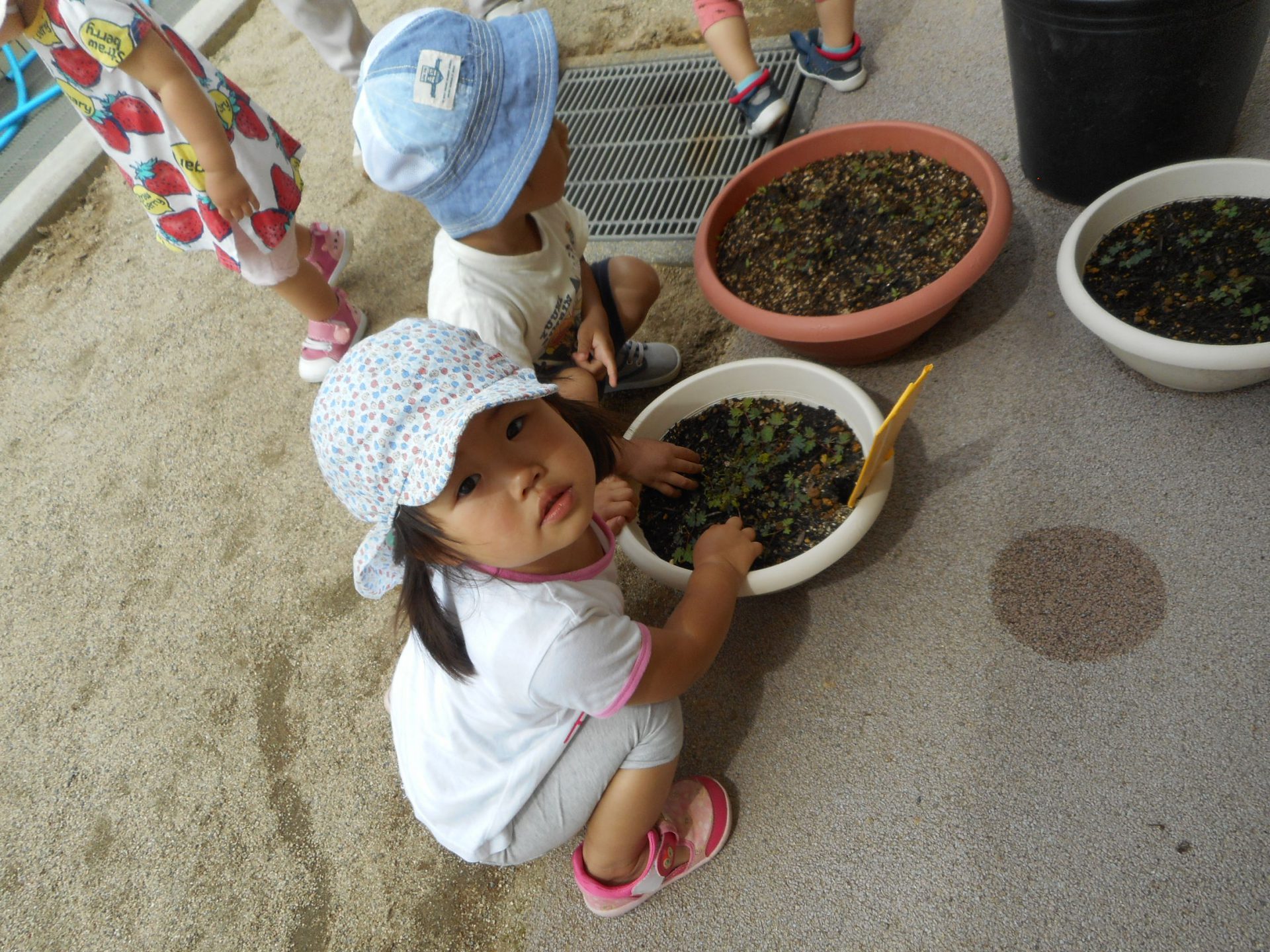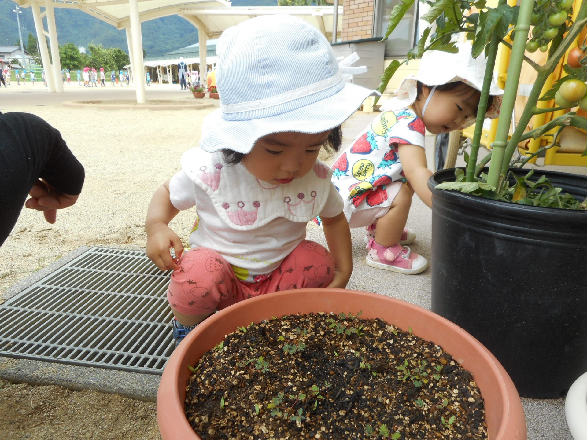 種まきを経験してから、花壇のお花やプランターのおじぎ草、ミニトマトなどにも水くれをしてくれ大切そうに触れたりする姿が見られました。