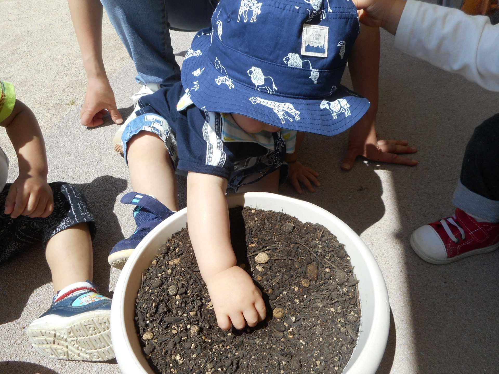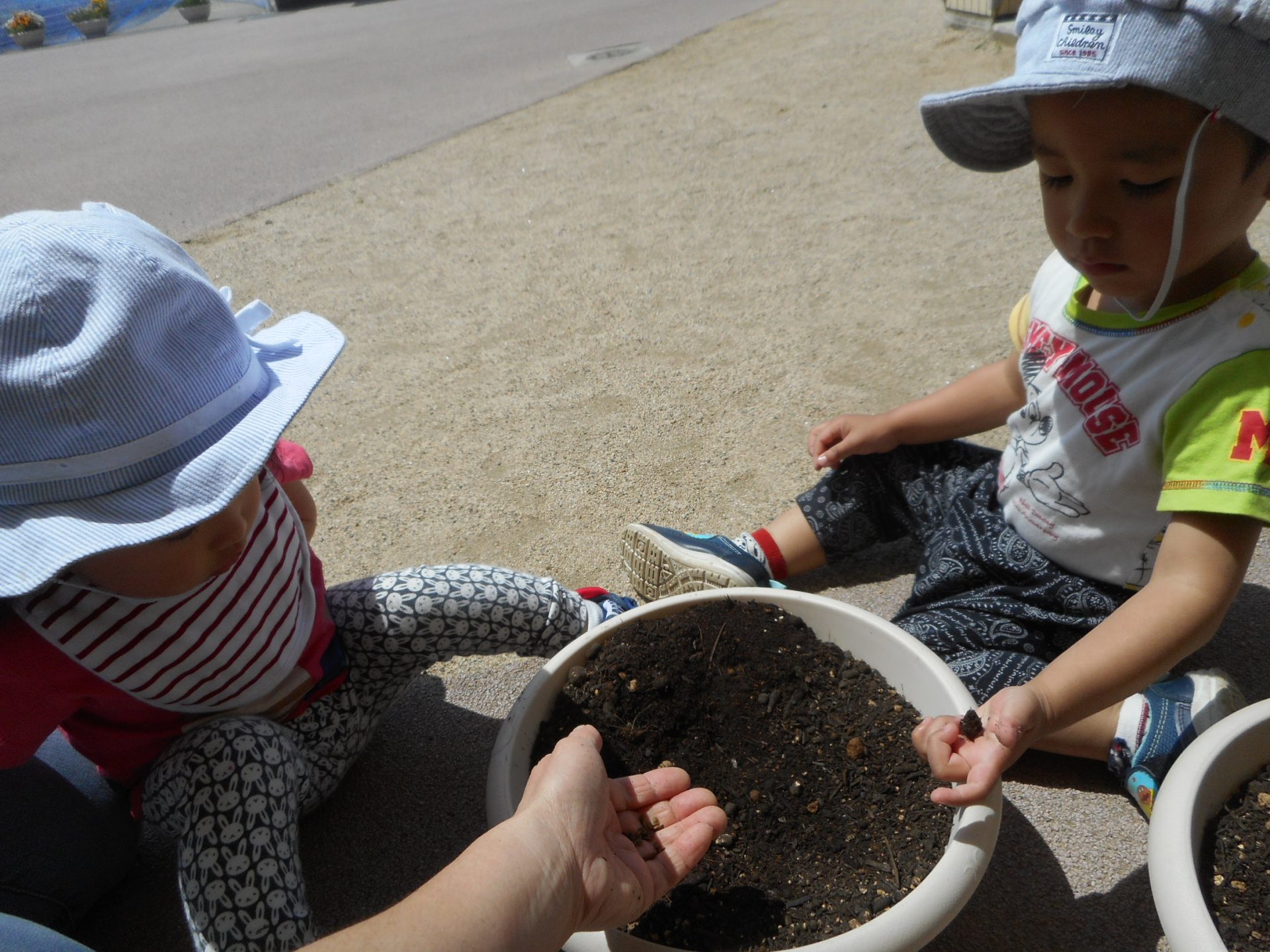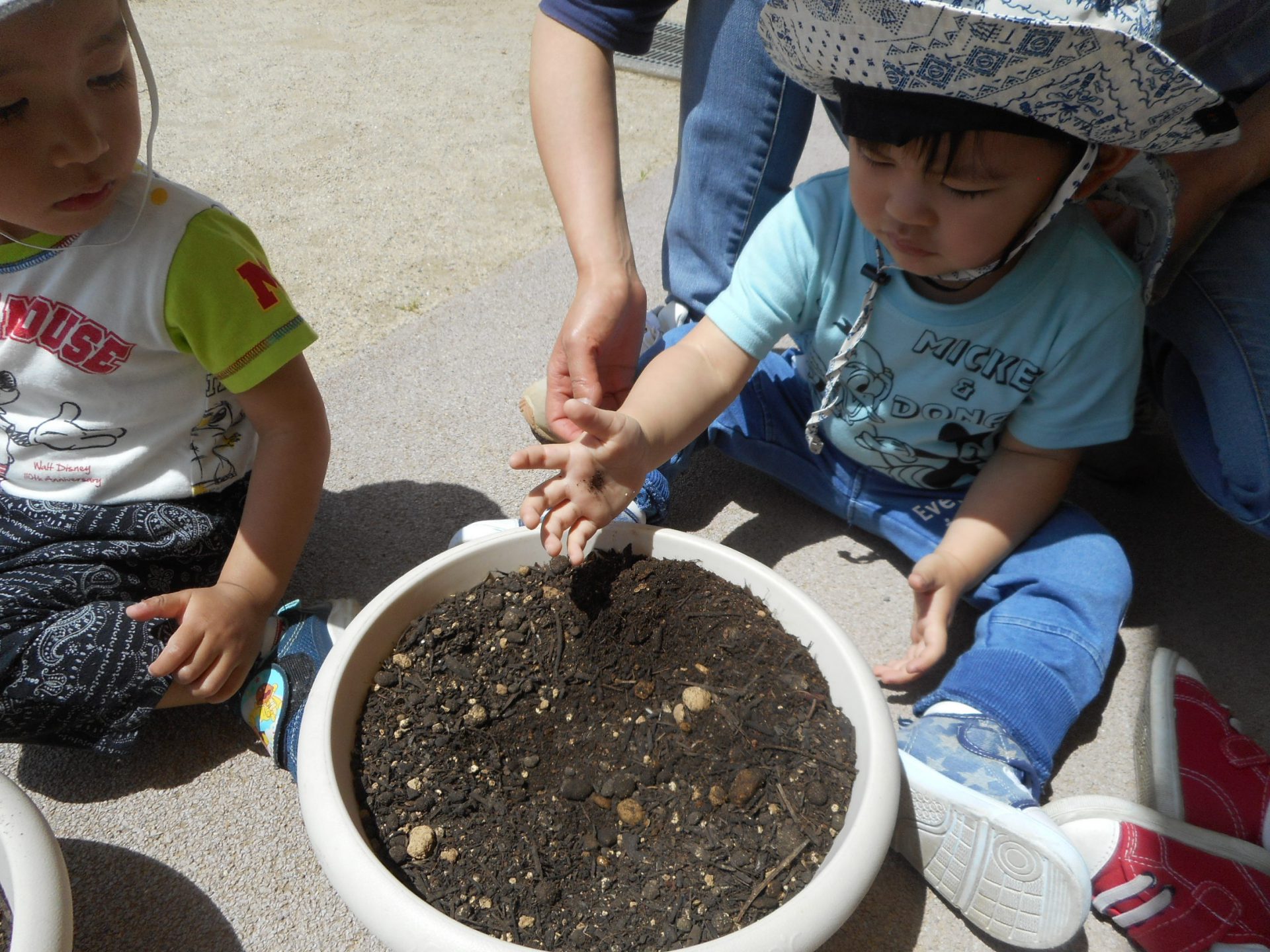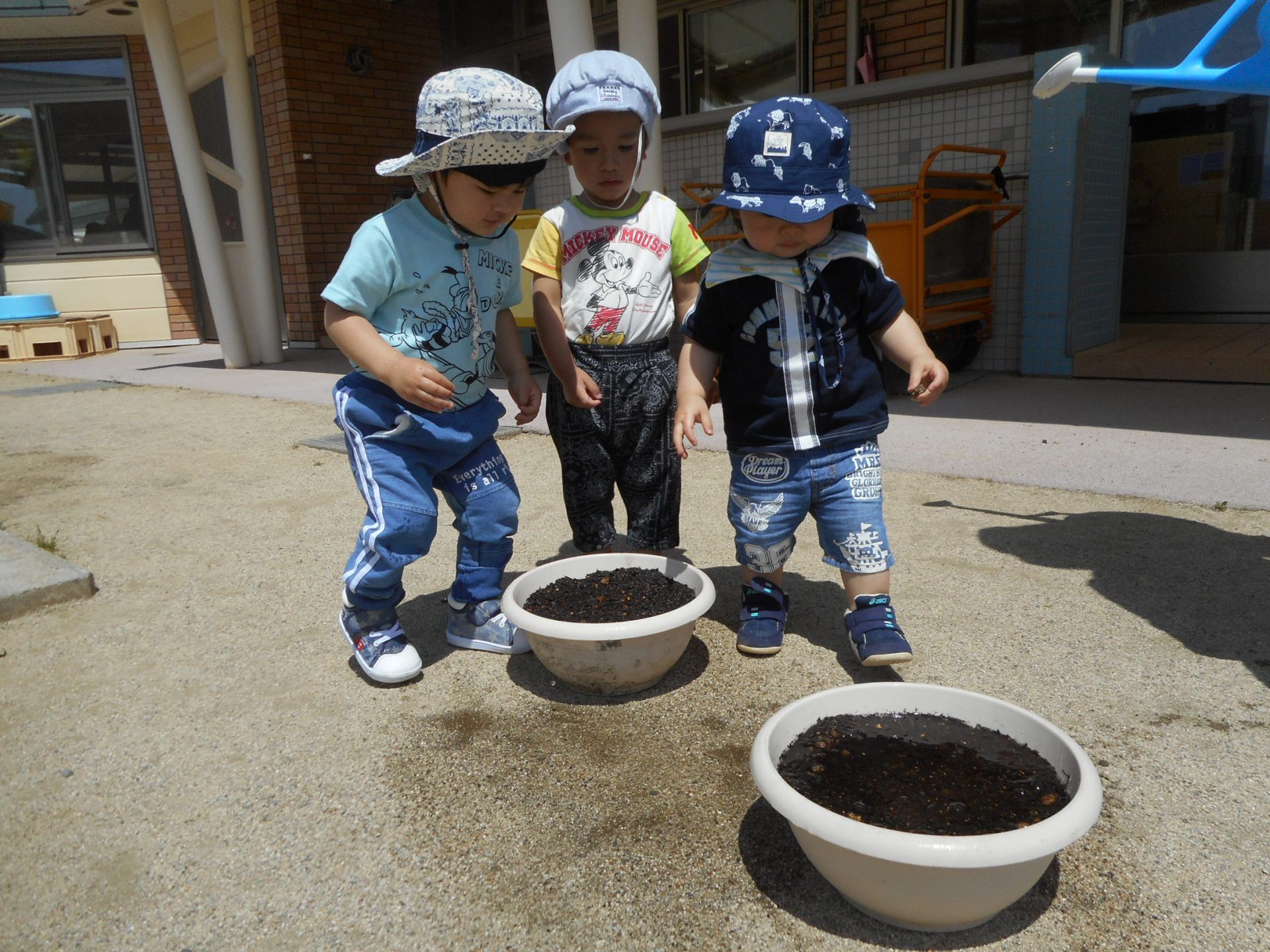 種まきを経験してから、花壇のお花やプランターのおじぎ草、ミニトマトなどにも水くれをしてくれ大切そうに触れたりする姿が見られました。