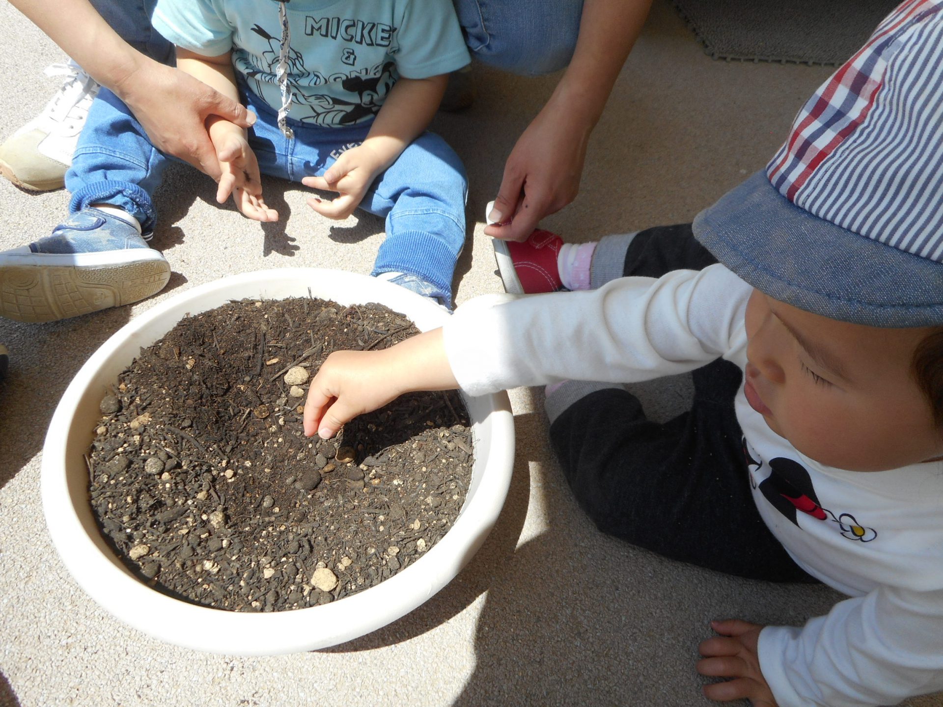 保育士がプランターに種をまいていると次々のぞきこんでくる子どもたち。