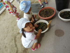 「何だ?これ?」「虫さんかな?」春に園庭で虫探しをしていたので中には小さな虫さんだと思った子もいました。