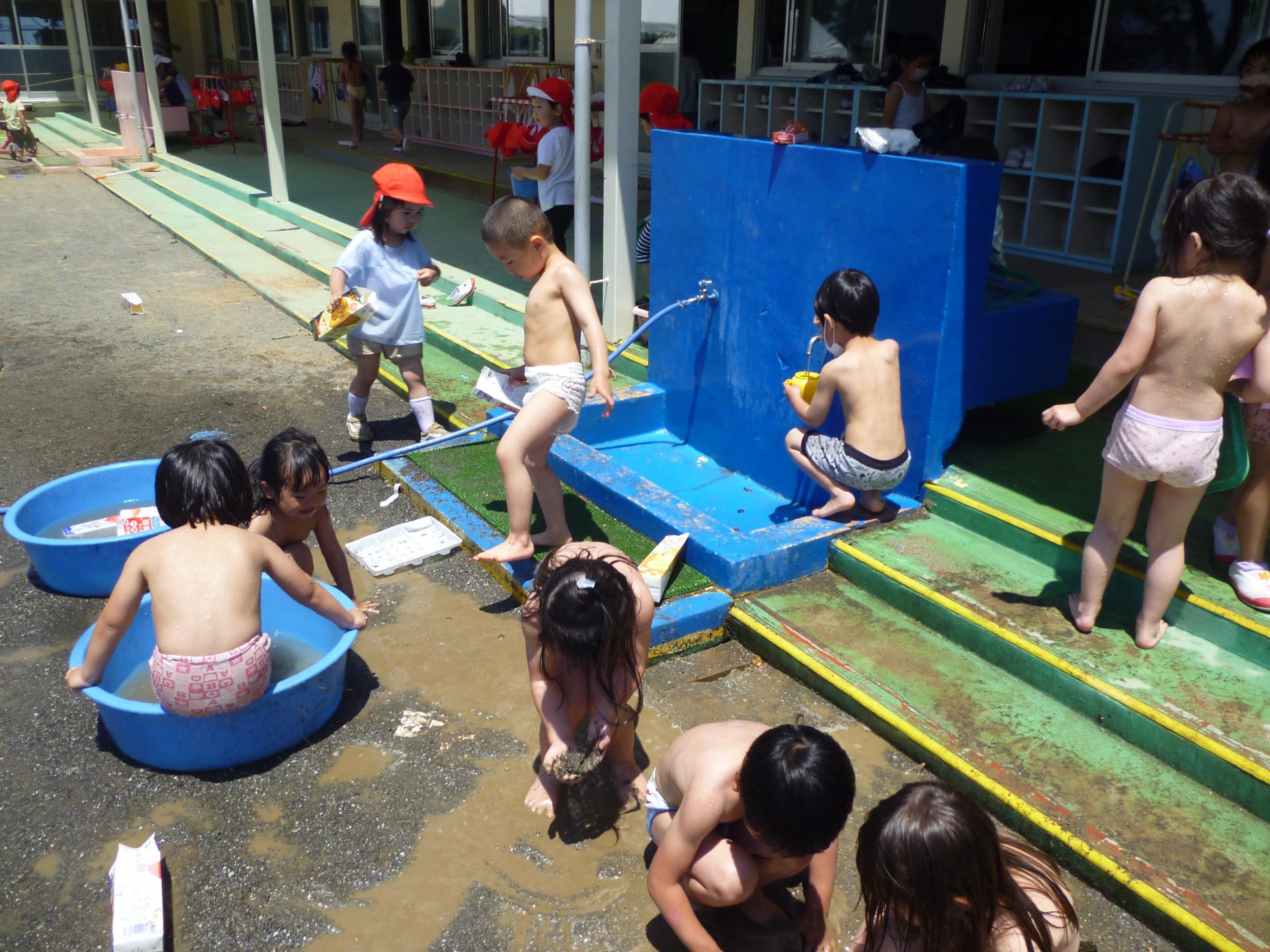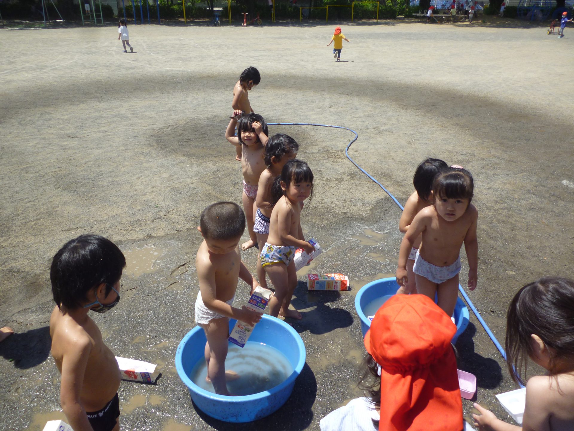 「あつい~」と言っていた年中組の子どもたちの声を聞き、「じゃあ、大きなたらいを出して水遊びする?」と声を掛けてみました。早速「やるやる!」との返事が来たので、まずは年中組の子どもたちと一緒に園庭で水遊びをしていました。すると、その様子を見た年少さんが、「やりたい1」と言ってきたので、皆でしばらく水遊びを楽しみました。