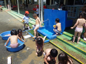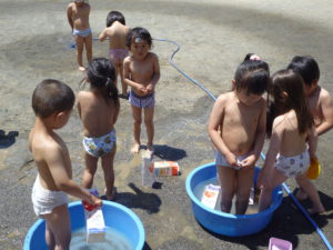この頃は天気の悪い日々が続いています。今日は、少し前の出来事ですが、天気のいい日に年少さん、年中さんが園庭で水遊びをしていた様子をお知らせしたいと思います。