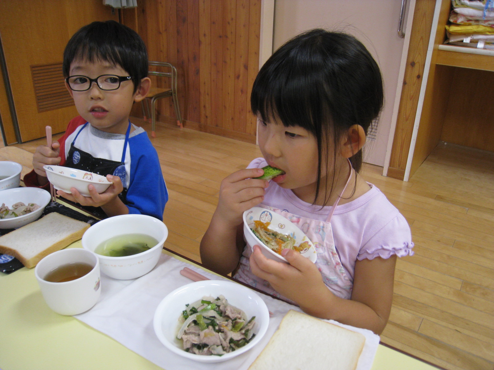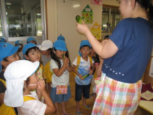 「本当の収穫時期がわからないけど、花が枯れ落ちたから収穫時期じゃないかなぁ」と年長担任。
