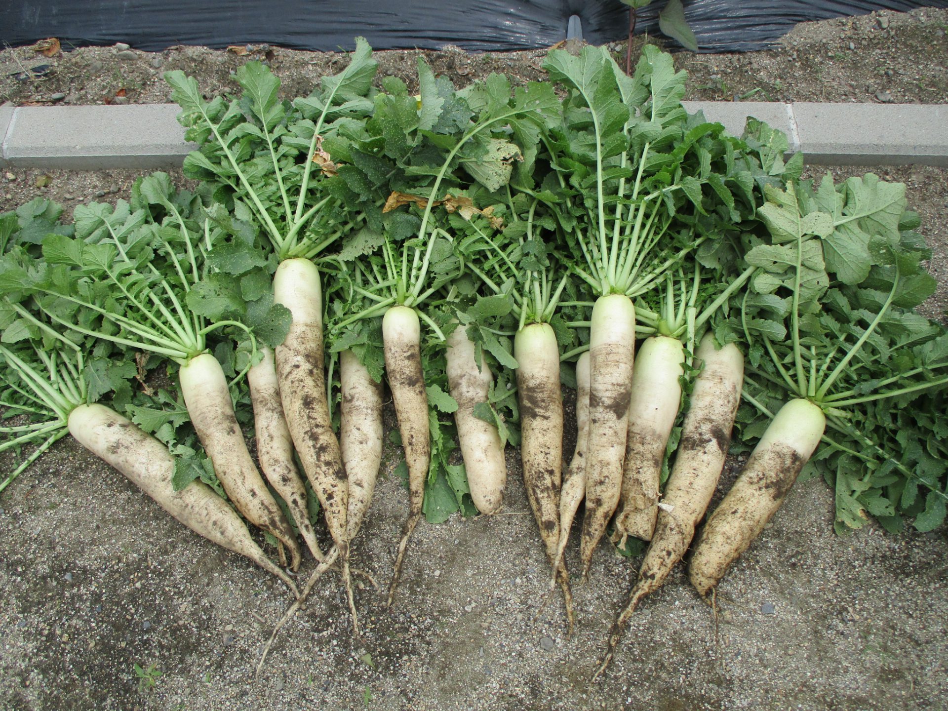 「漬け物にする?」「大根サラダがいいな。」「大根のお味噌汁おいしいよね。」
