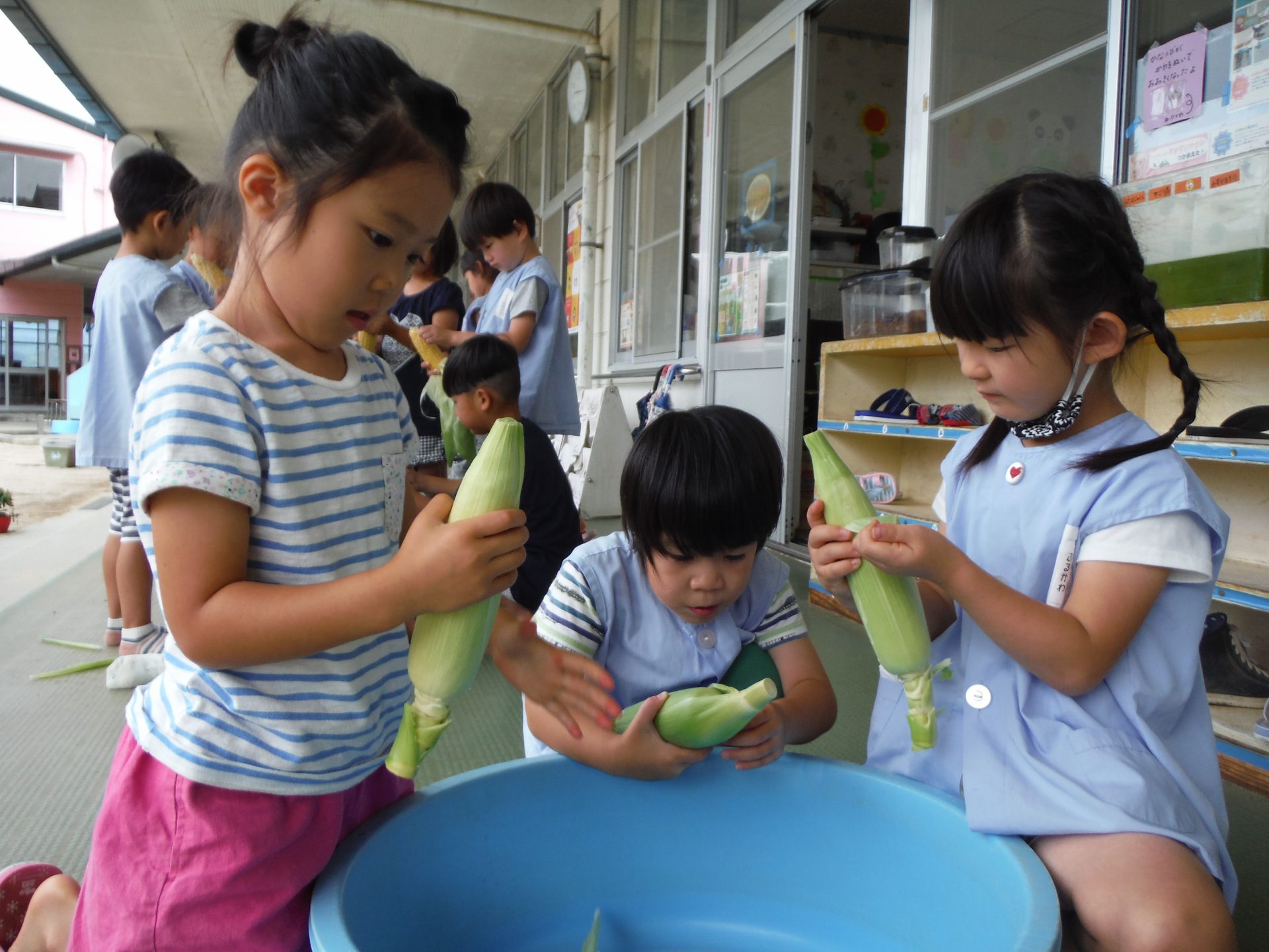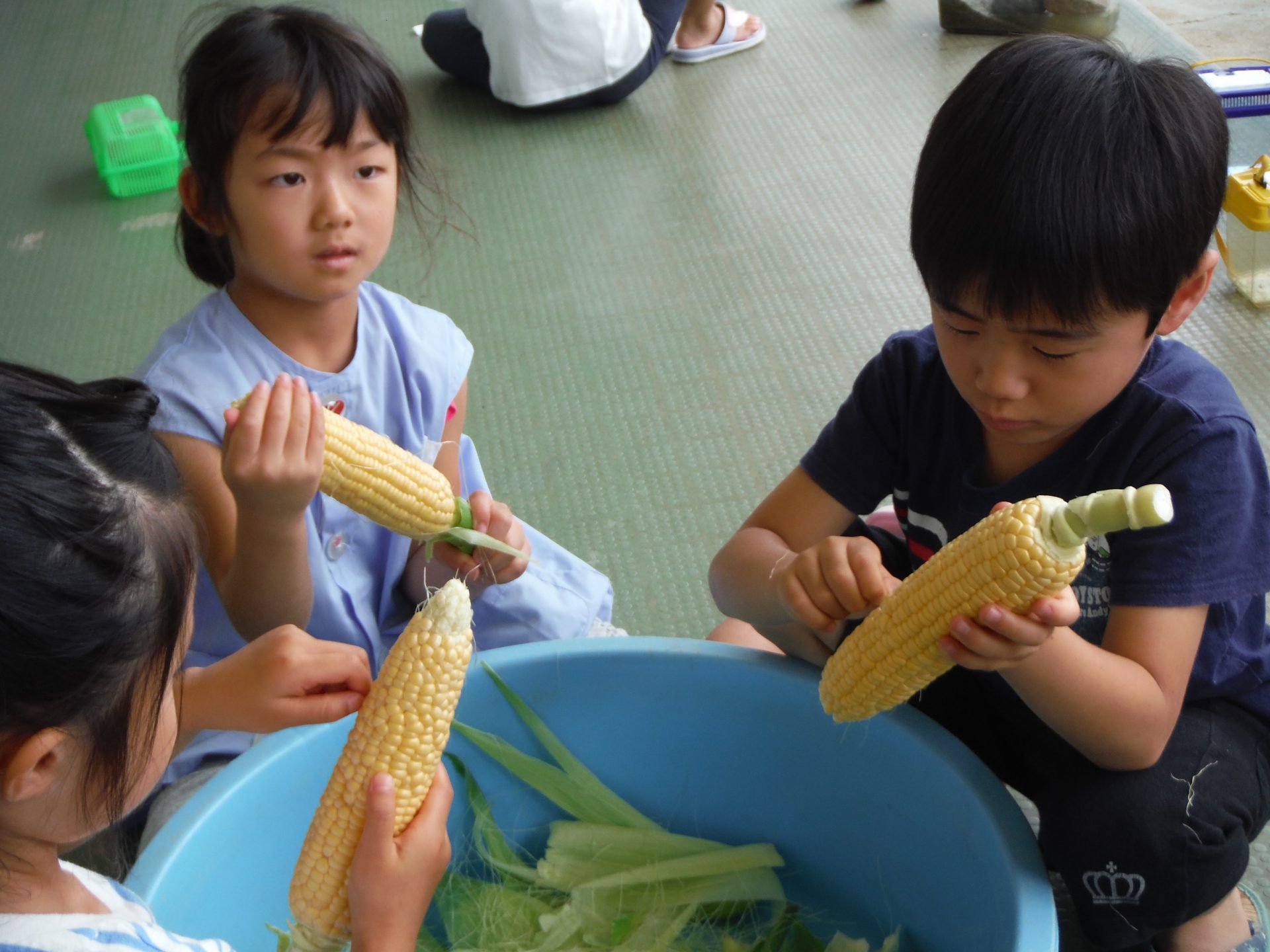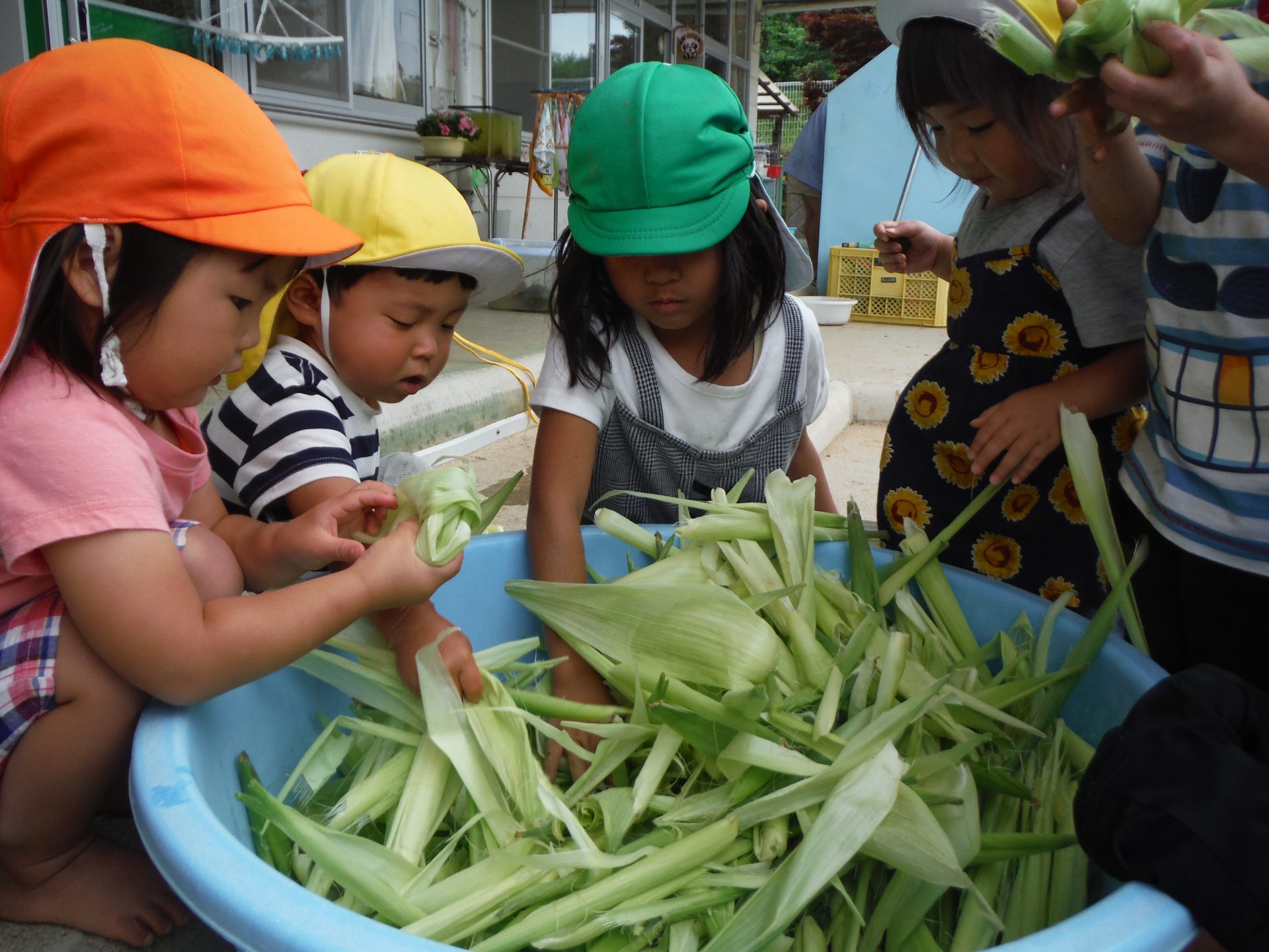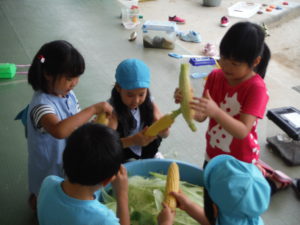 給食の先生からとうもろこしの皮むきを頼まれた年長児、