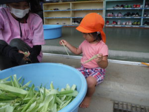 *皮むきだけの活動でなく、茎、皮を使っての遊びを子ども達も考え遊ぶことができたことで、子ども達も職員も発見がいろいろあった。