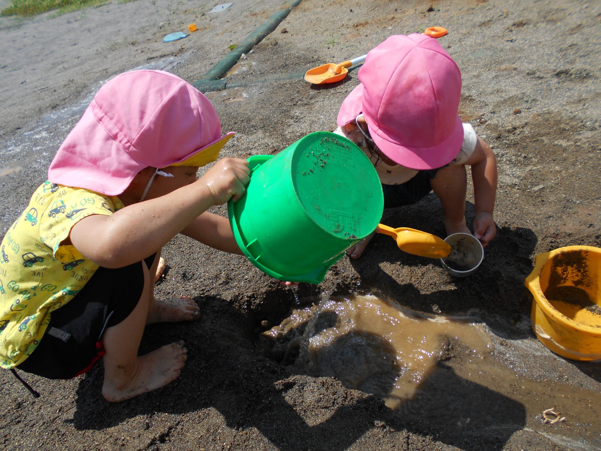 みんなで協力して山を作ったり、川を作ったり、そこに水を運んで流したり、あそびの中から自然に子ども達同士の関わりも広がっていきます。