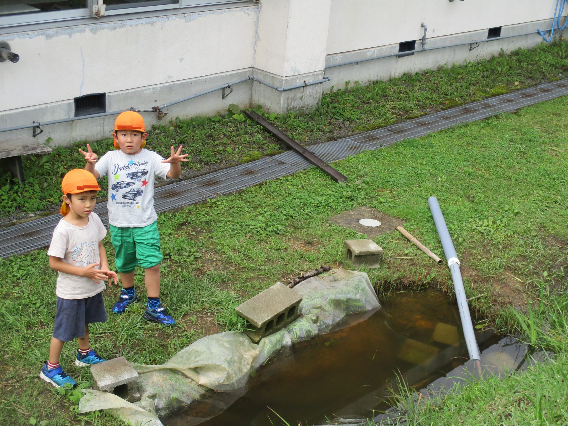 わくわく広場には去年の年長さんが作った池があり、今年はそこに生き物達が住みつきました!
