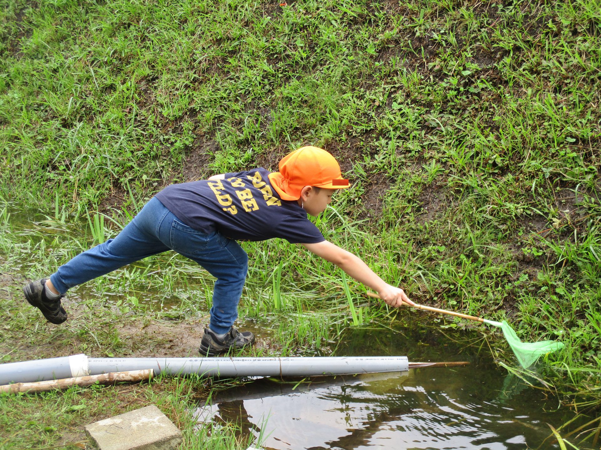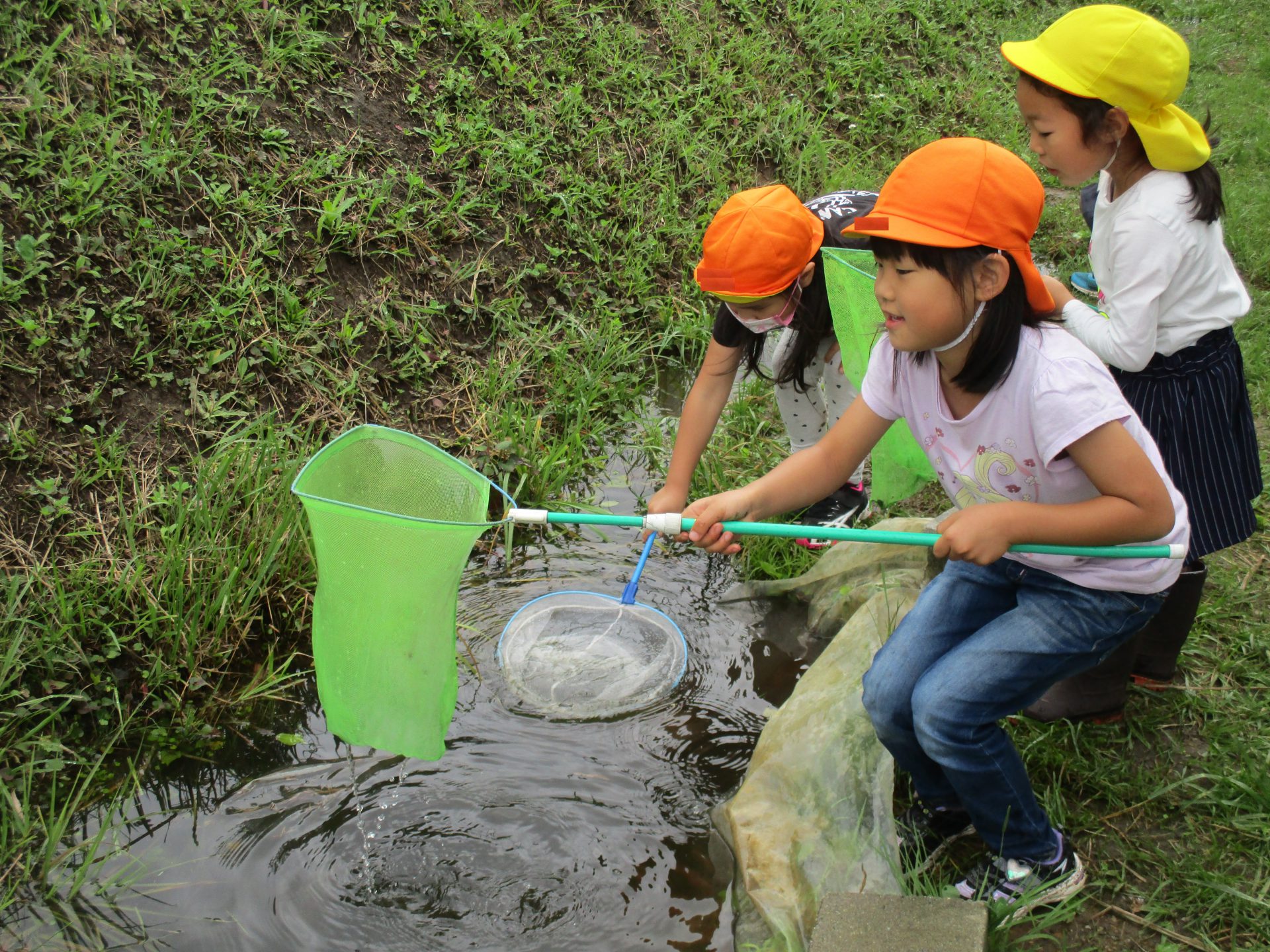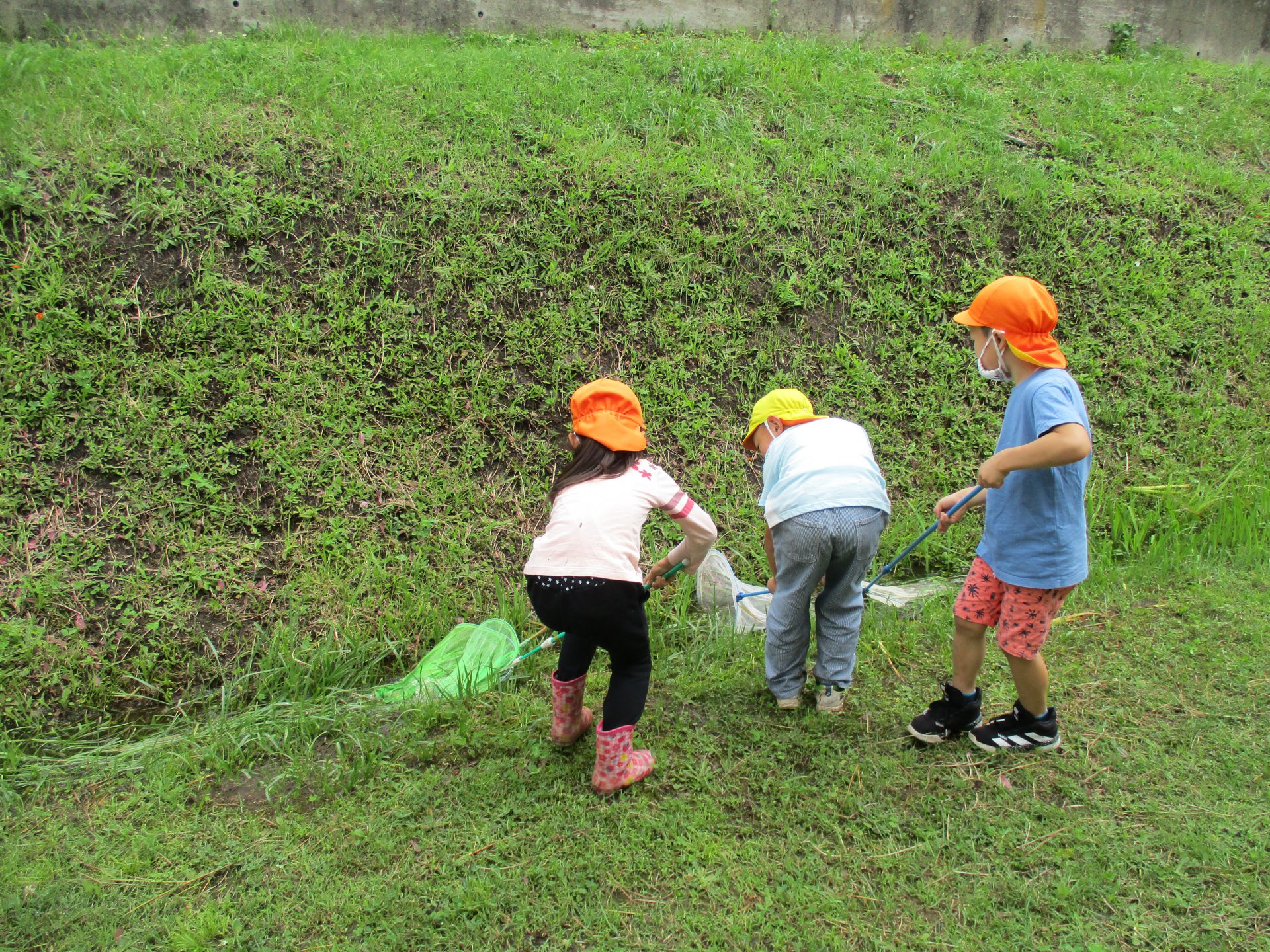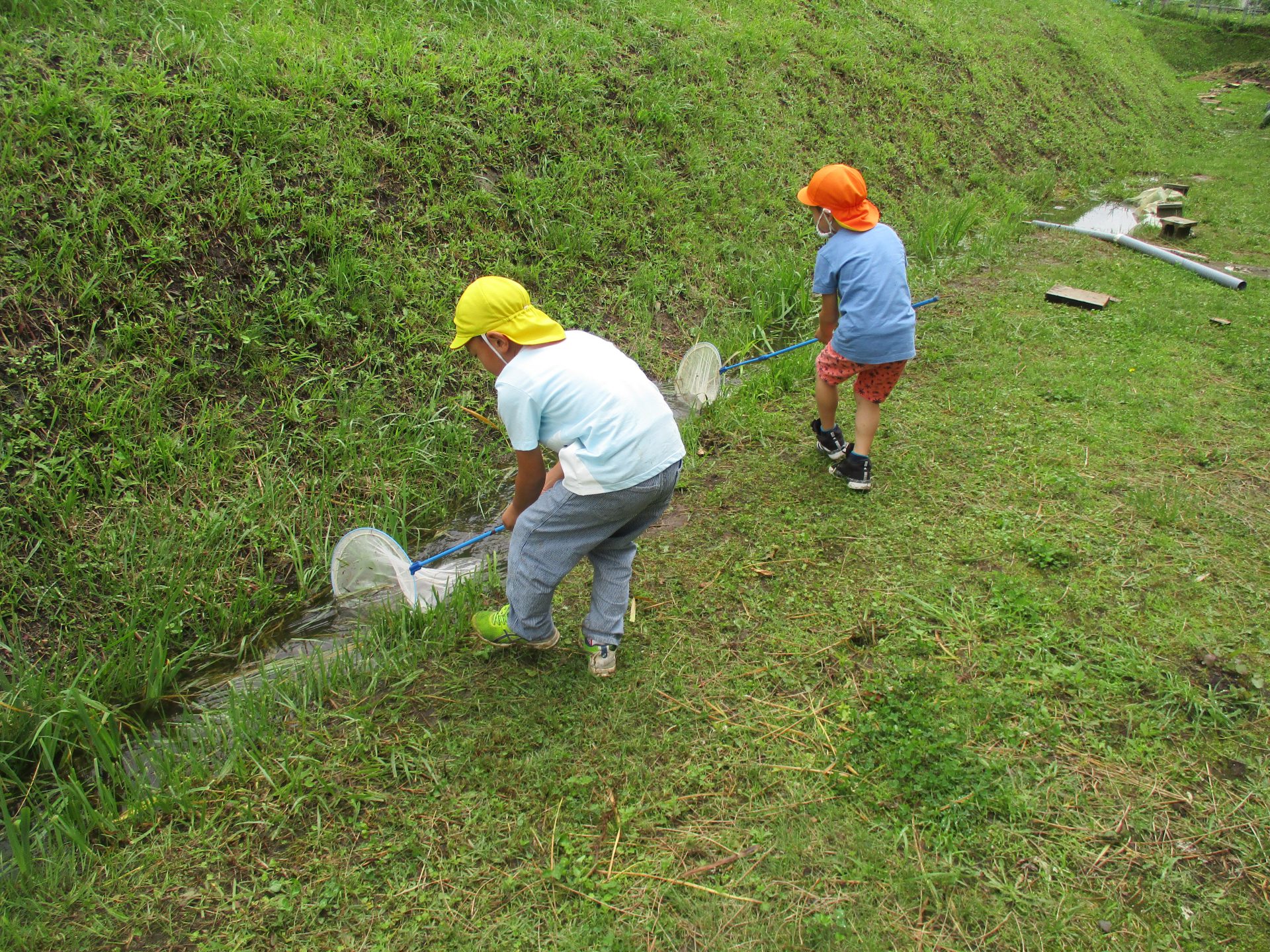 連日の大雨で池の水が氾濫し、池にいたおたまじゃくしも流れ出た水にのって脱走してしまったんです!それを見た子ども達が「池に戻してあげないと!」と虫取り網を持って救出を始めました。
