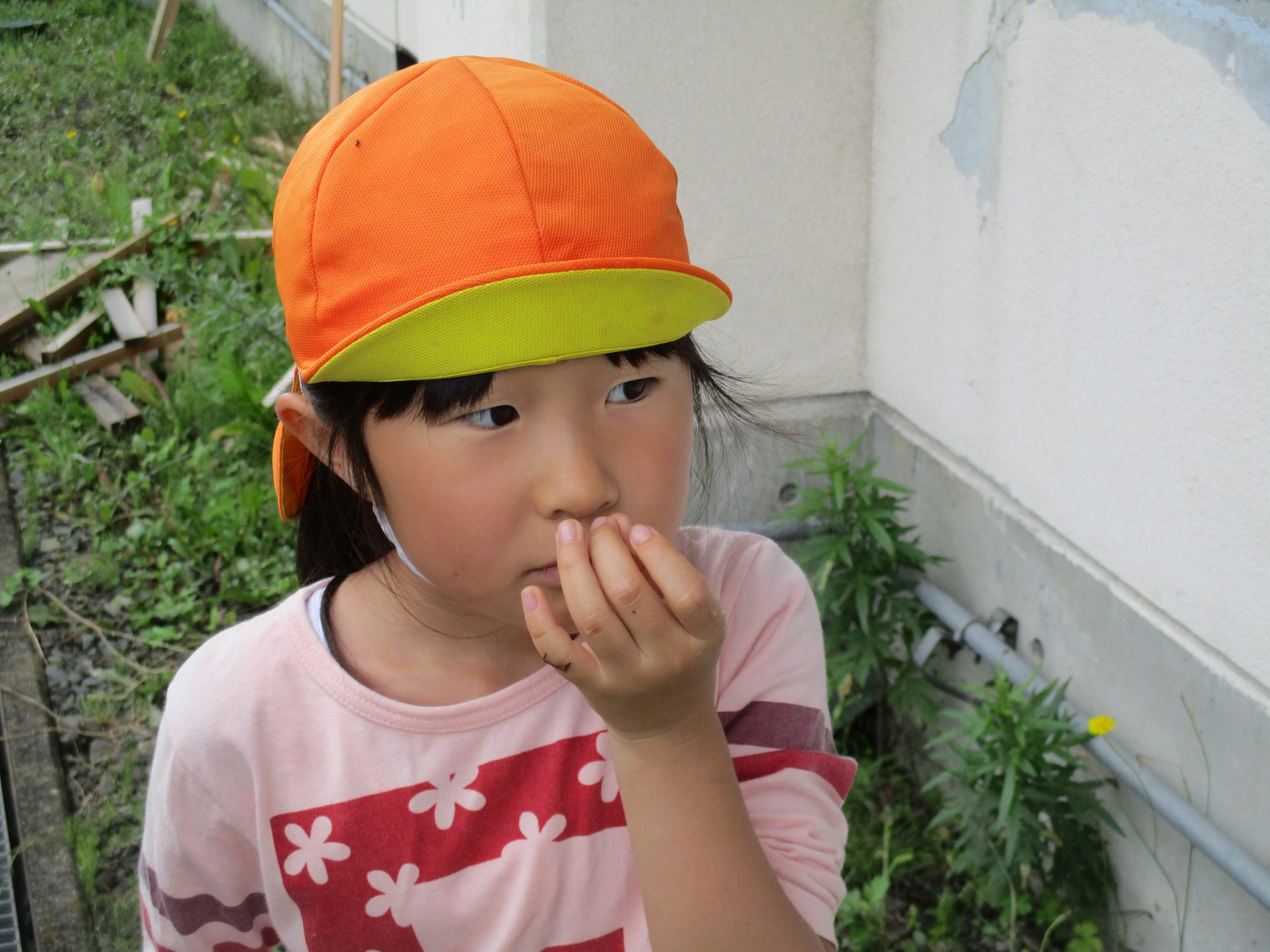 バッタ探しから、バッタのジャンプする様子をじっくり観察し捕まえ方も変わってきました。バッタがいるからただ手で押さえて捕まえても捕まらない。だから、バッタが止まってる時にさっと捕まえたほうが捕まえやすいよと友達に教えてあげる姿も。そして、バッタと色々な種類がいて、今までは茶色いバッタが多かったのが今は緑色のバッタも多くみられるようになり、「これはトノサマバッタだ!」と。