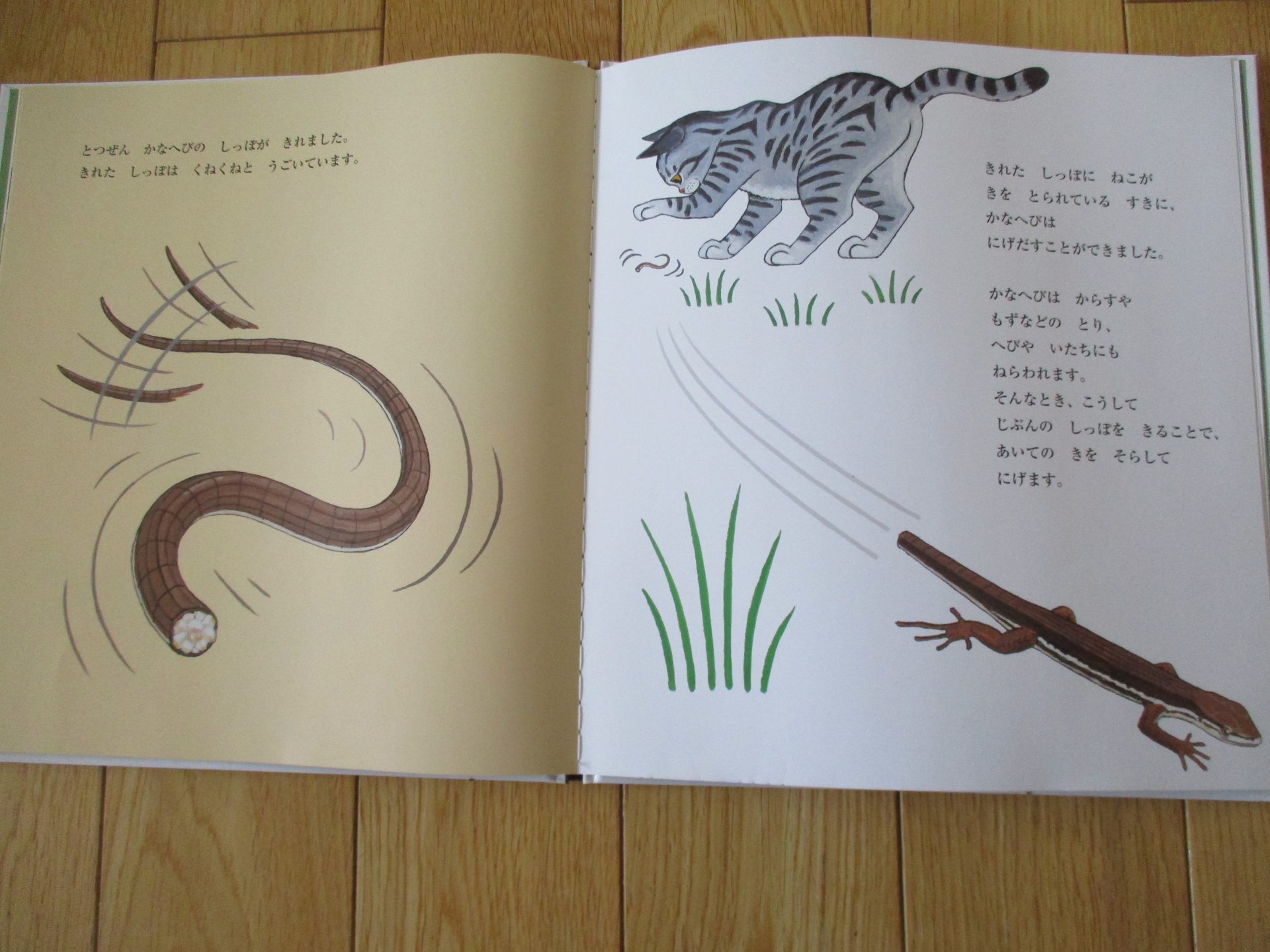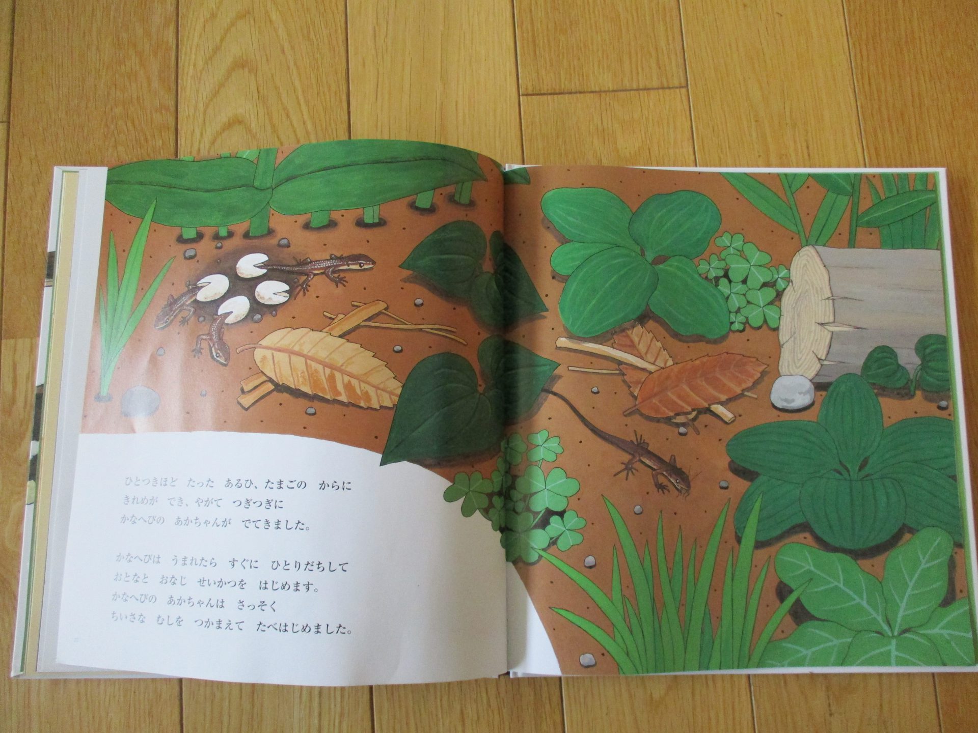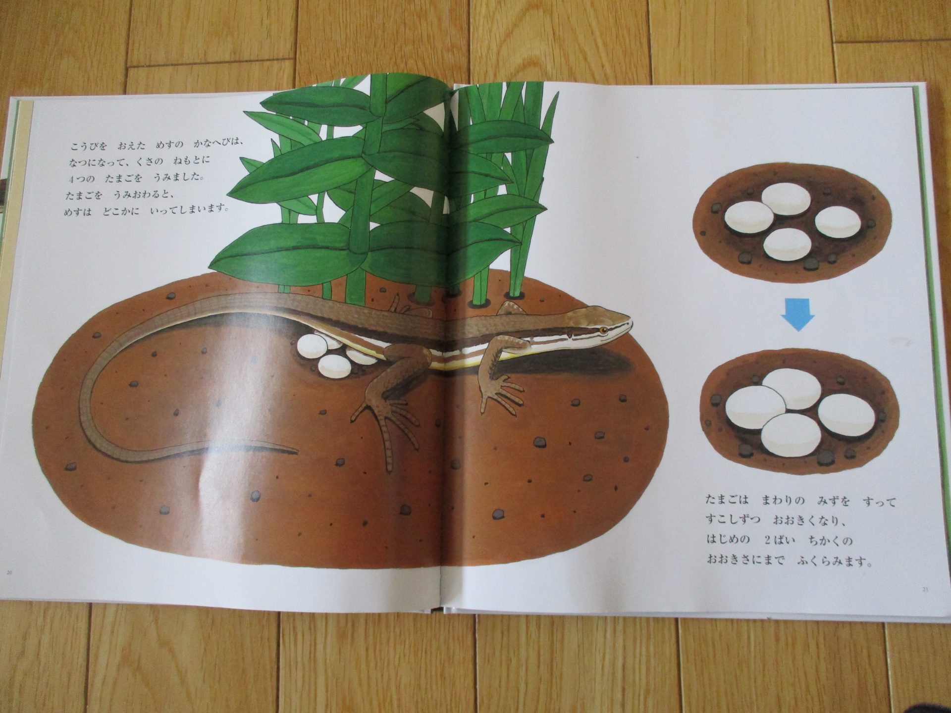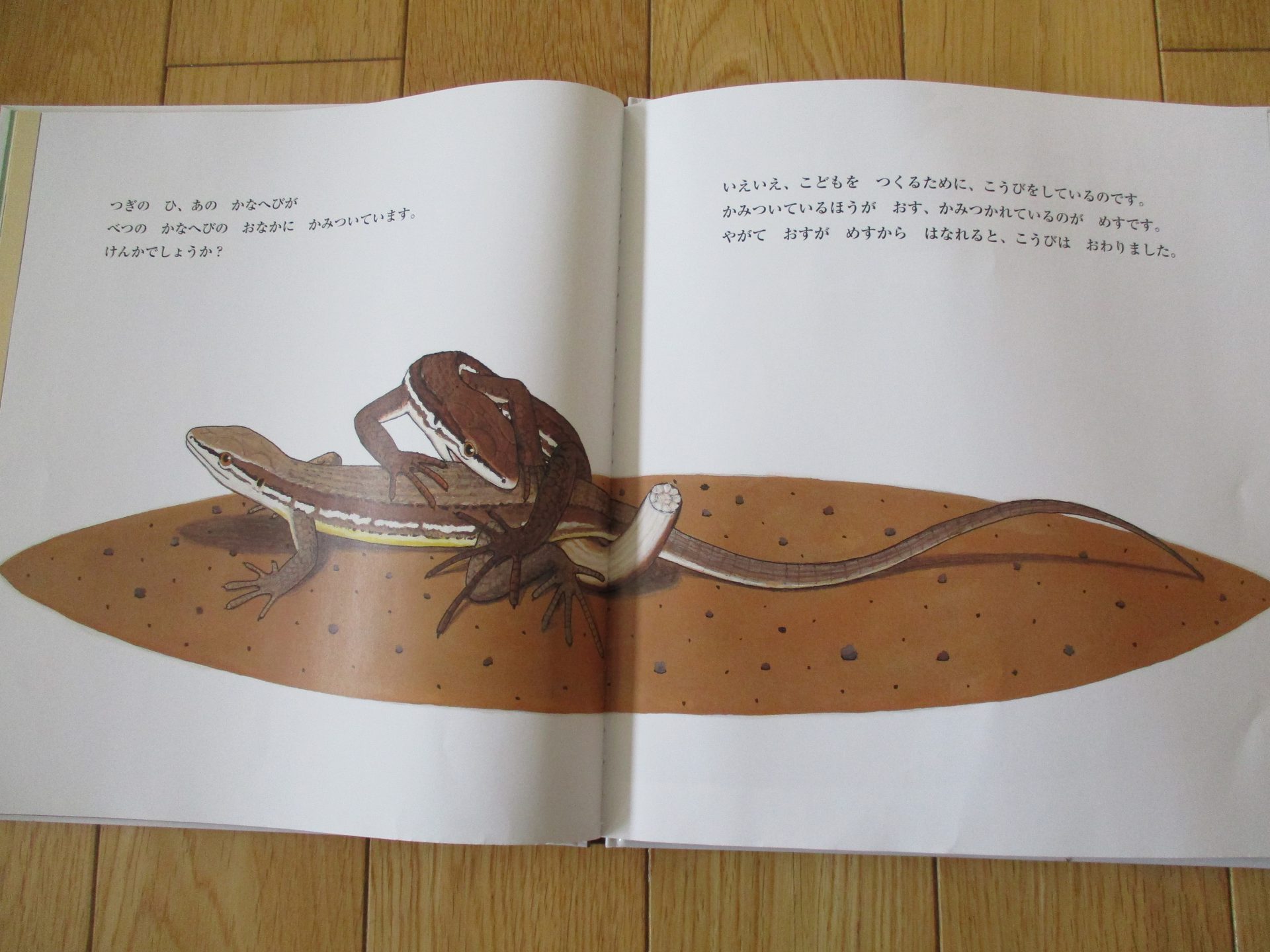 いろんな場面がでできて、カナヘビの生態を知れる絵本です。その本を見たあと、部屋で飼っているカナヘビの結婚式を見ることができたんです!