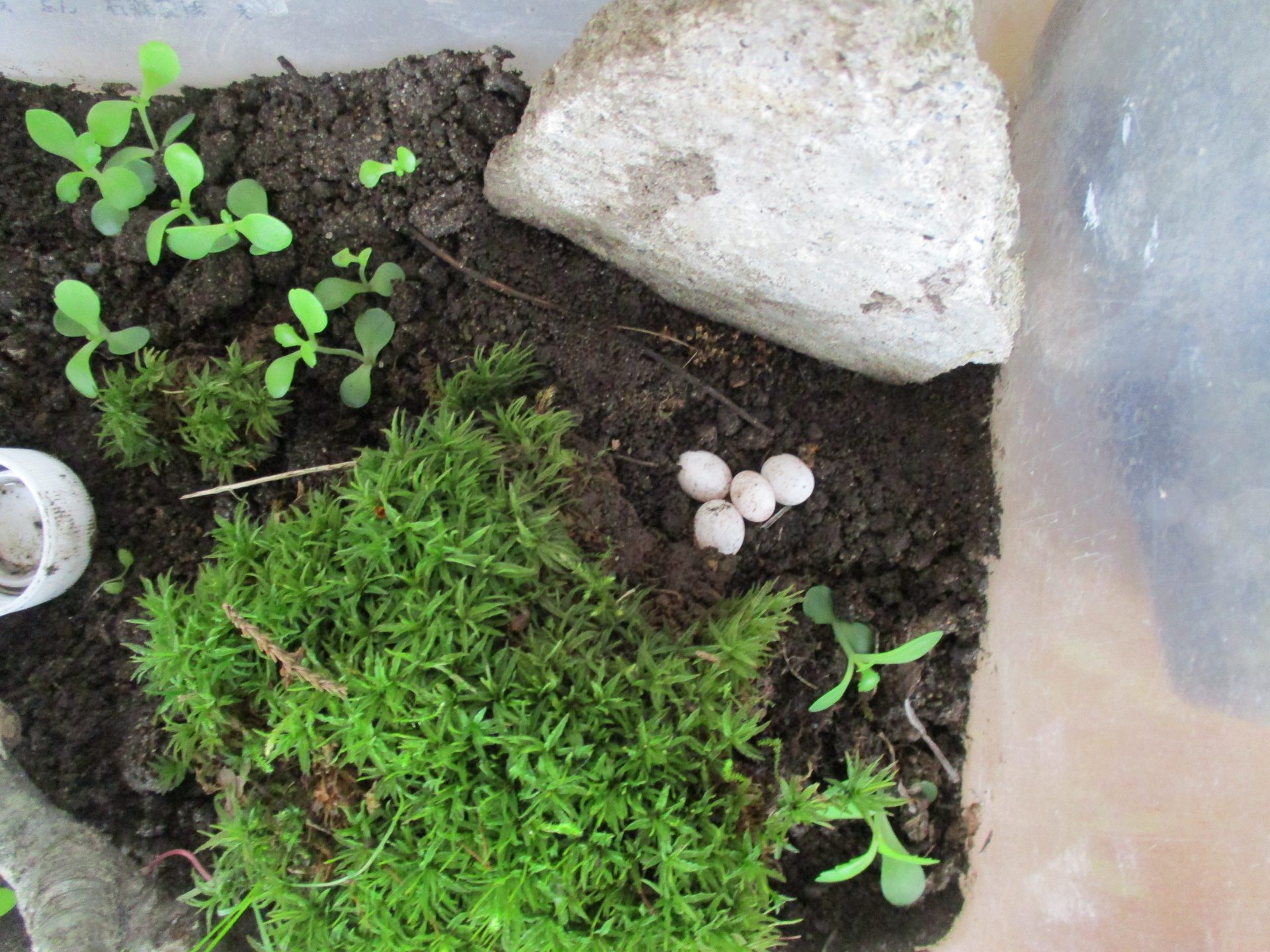 子ども達の今の興味が1番高いのはカナヘビです!お腹の膨らんだカナヘビがついに卵を産みました。