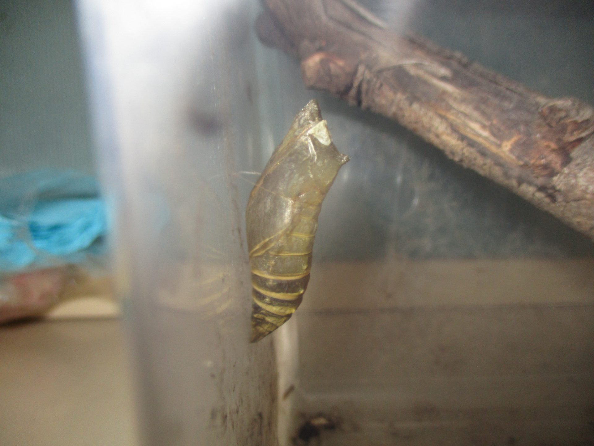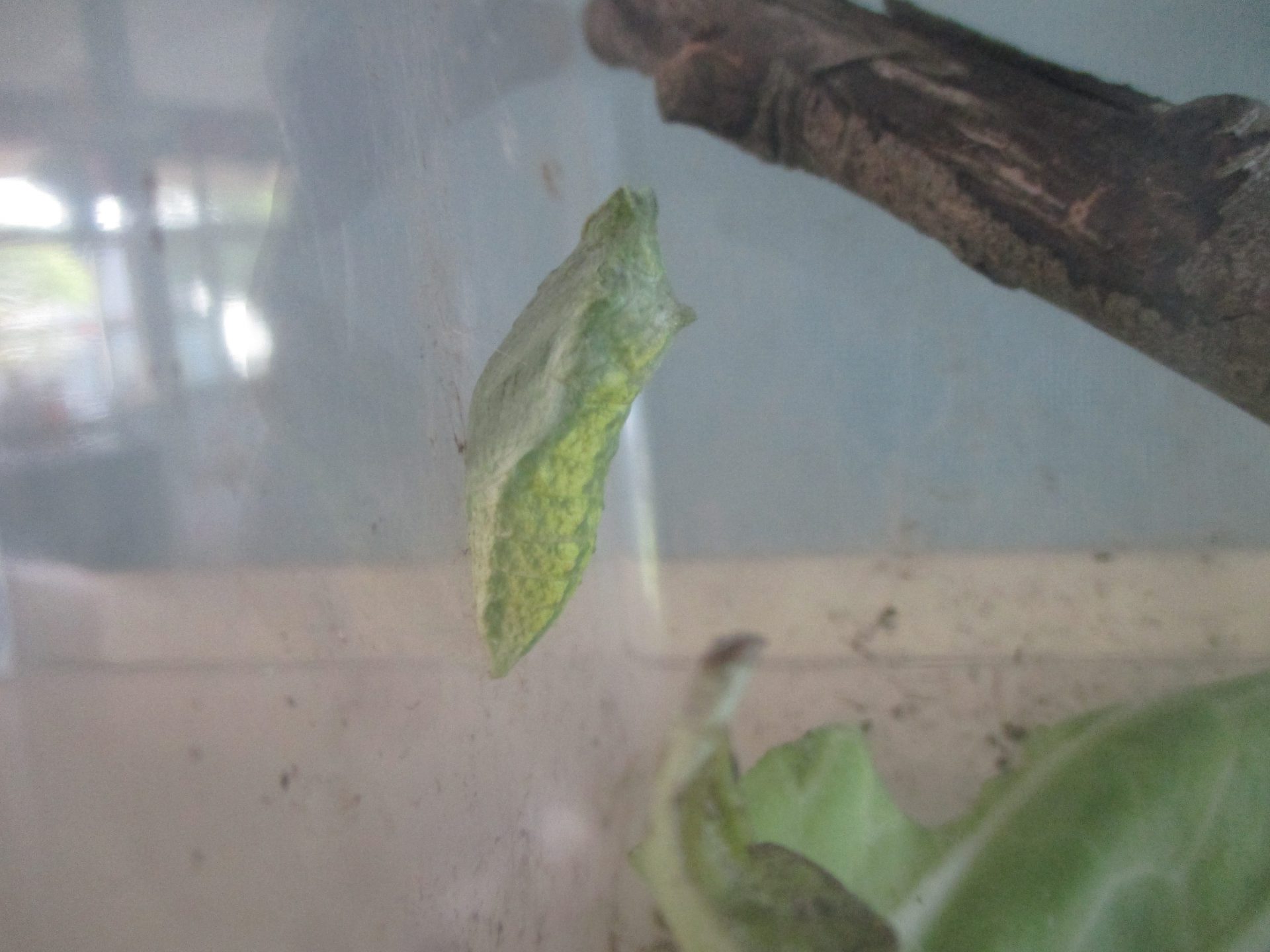 …が、アオムシはケースの側面にくっついてサナギになっていました。