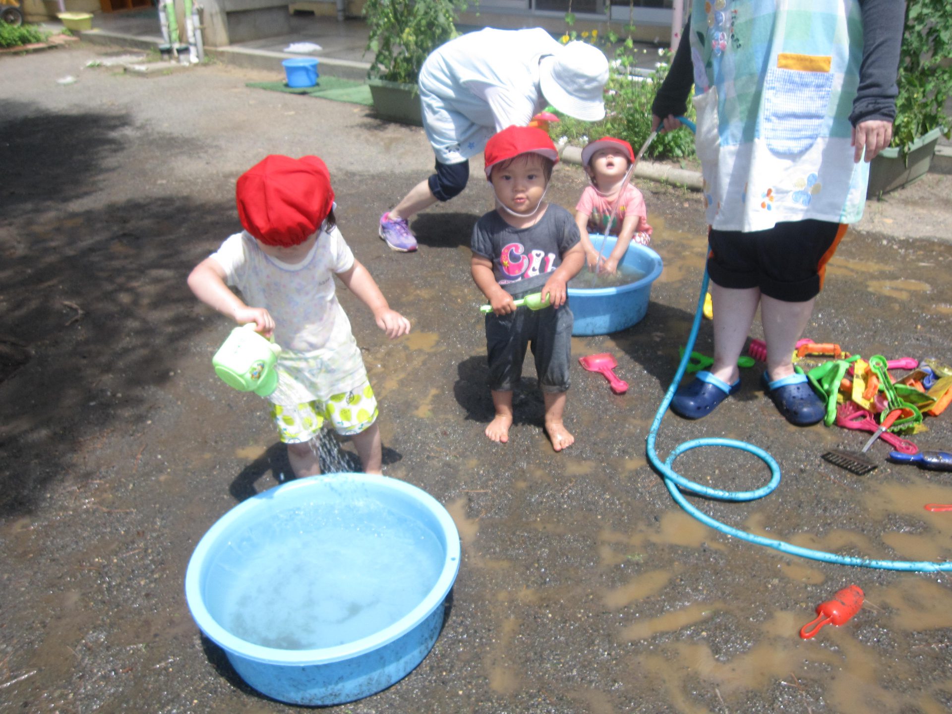 2歳児はシャベルなどの道具をつかって泥を鍋やカップに入れて楽しんでいます。1歳児は水が出ている所を不思議そうに見たり、0歳児は泥をペチャペチャとたたく感触を楽しんだり、年齢ごとの遊びを思いっきり楽しみます。