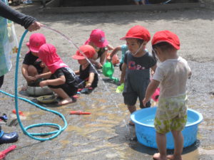 出てくる水を触ることからはじまり、道具を使って楽しむなど、遊びの変化を保育士も共に楽しみ遊びが持続する環境を学び整えていきたいと思います。