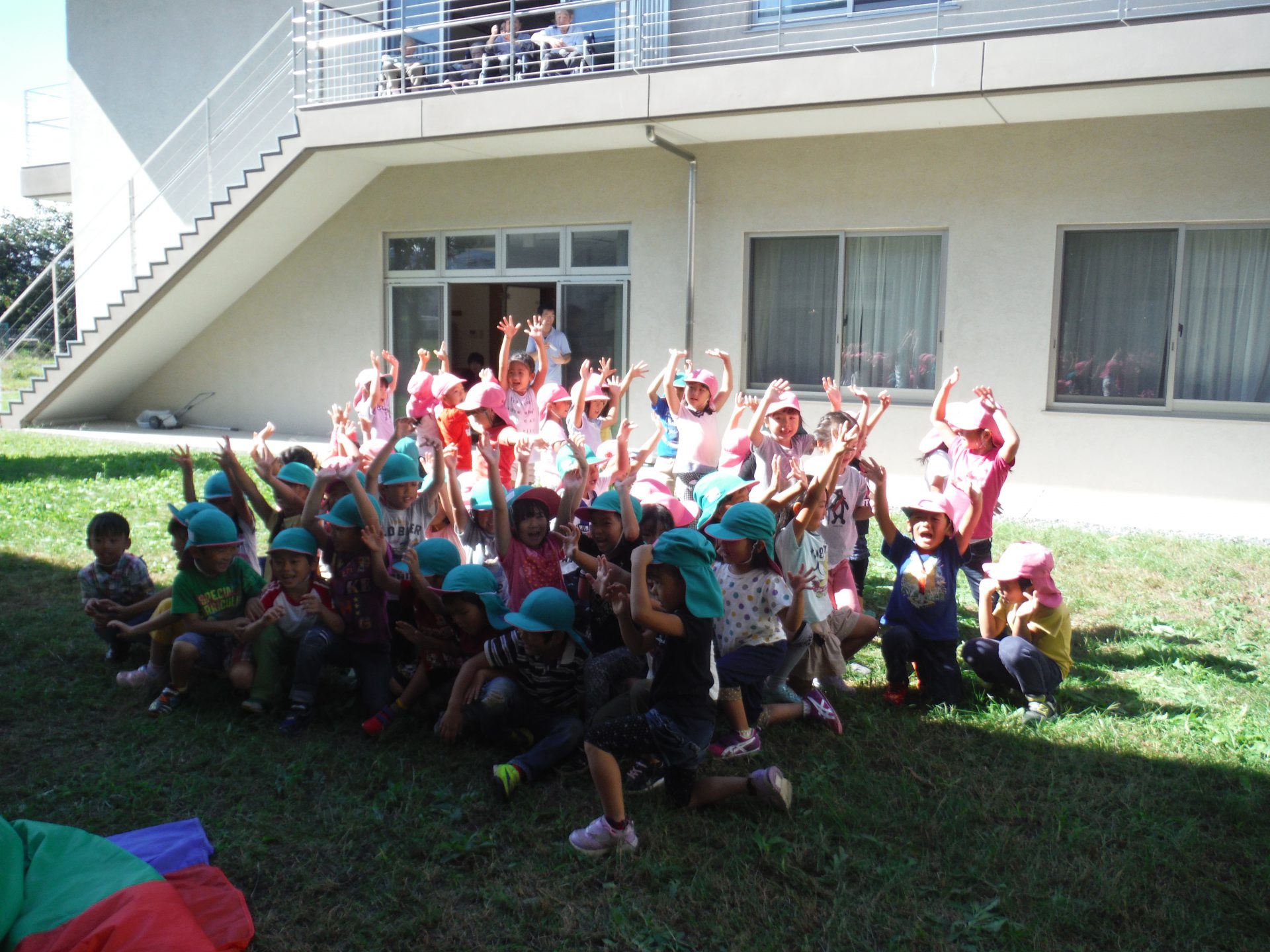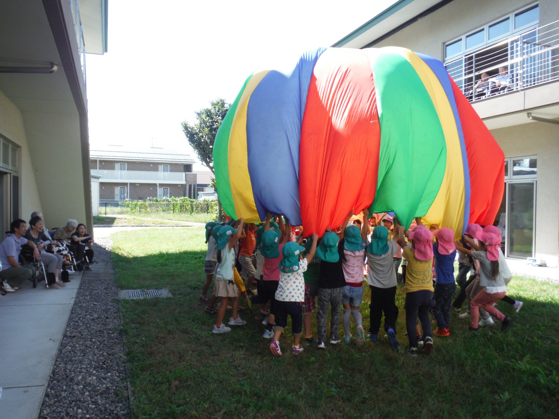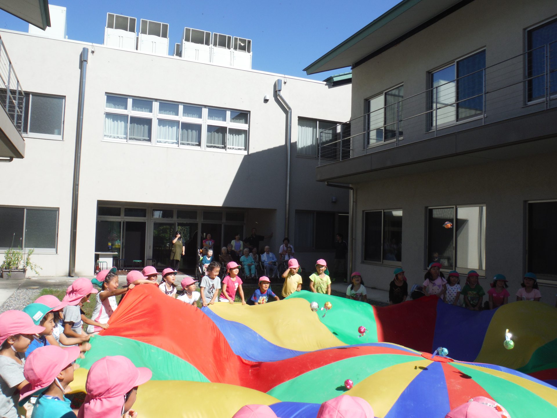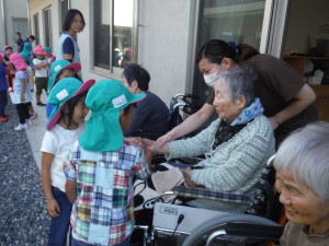 子どもたちの声に、ホームのおじいちゃんやおばあちゃんが皆中庭へ集まってきてくれました。
