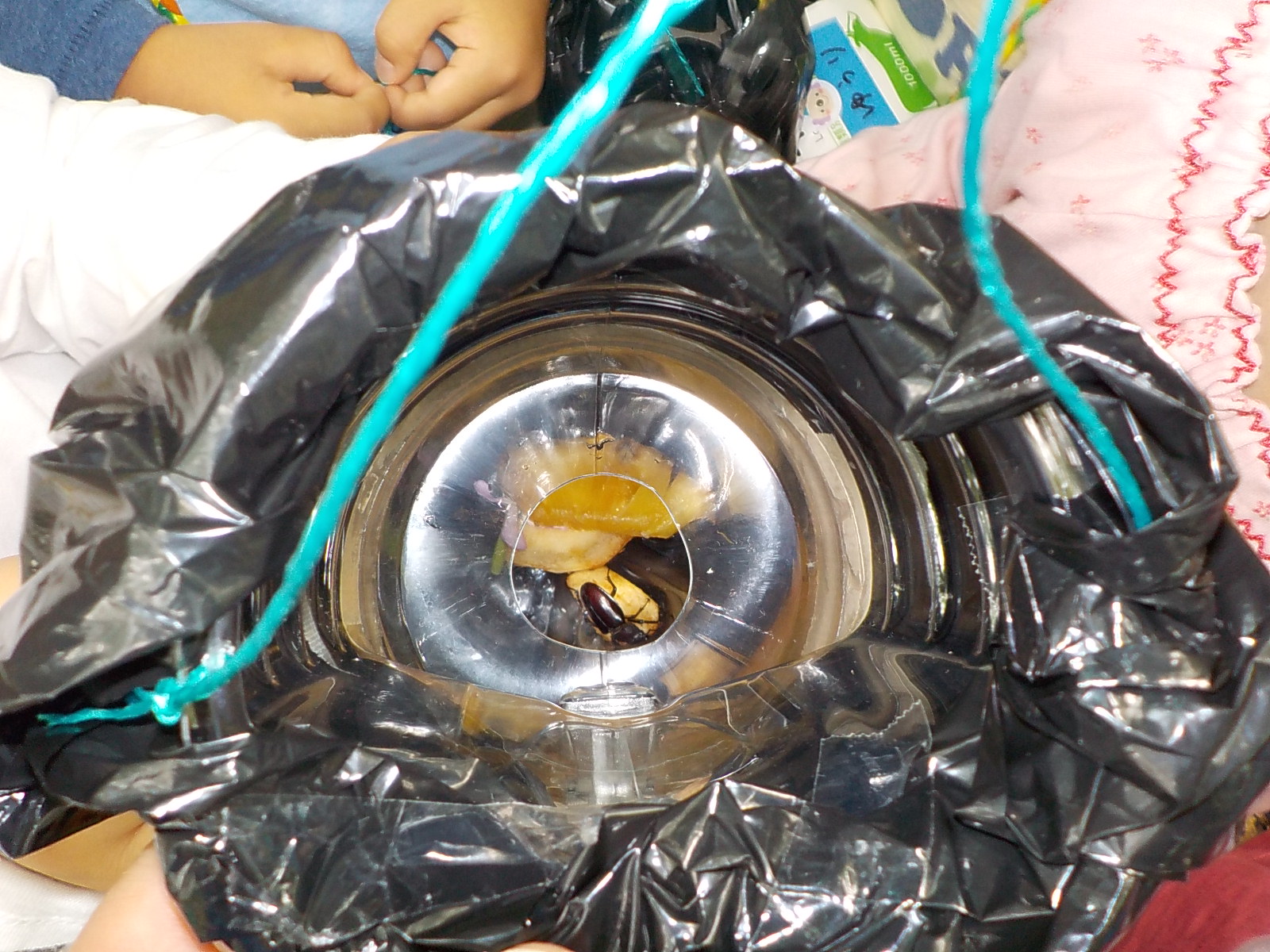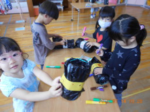 虫に興味関心を持っている4歳児。園庭や裏山で虫探しや観察飼育をするなかで、虫の特徴を捉えたり、命があることを知りました。園庭にかぶと虫の死骸を発見したことで、かぶと虫に興味をもち、裏山へかぶと虫を探しに行くようになりました。子ども達が「山にかぶと虫いるかな。」と言いかぶと虫を捕まえるためのしかけ作りが始まりました。「かぶと虫は、夜来るんだよ。」とペットボトルの回りを黒のビニールで覆いました。回りにかぶと虫の好きな食べ物の絵を描いて完成です。