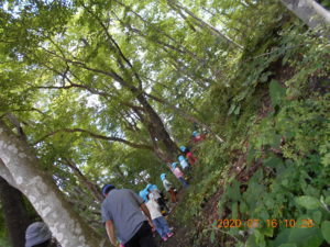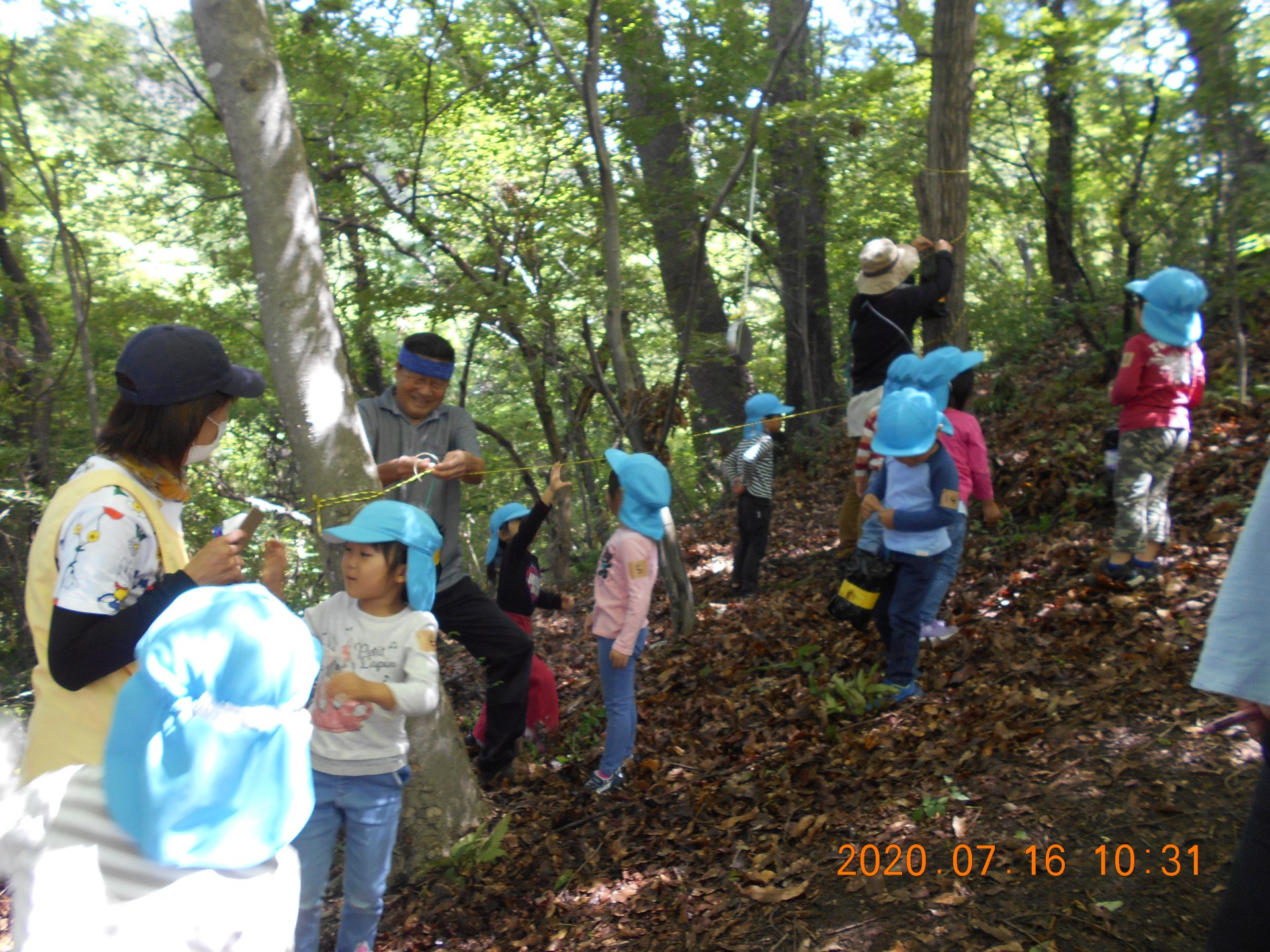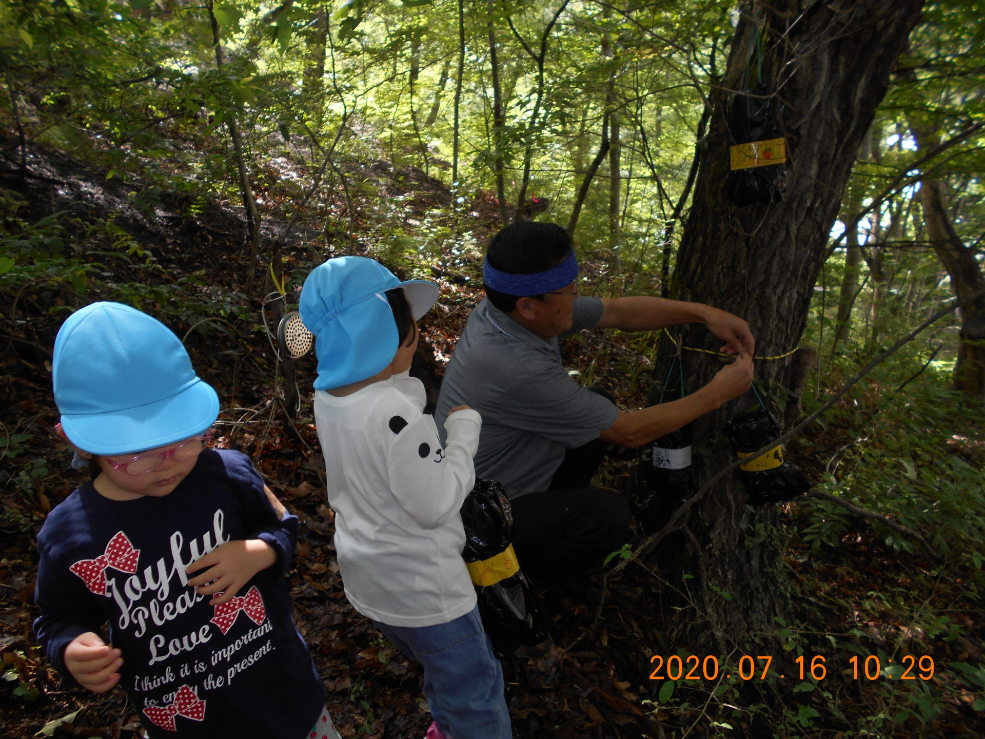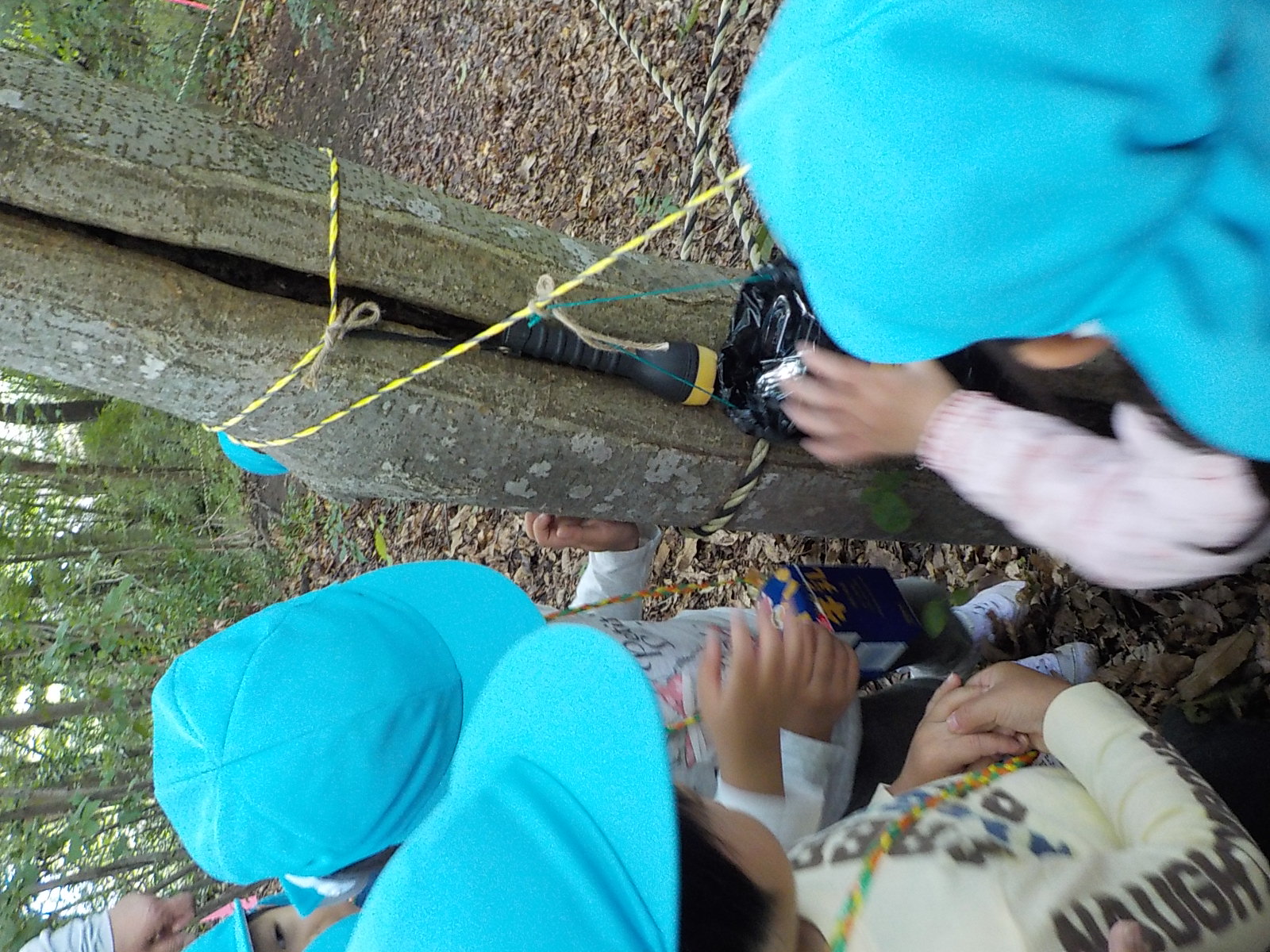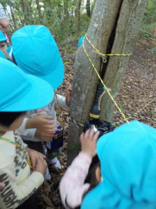 「かぶと虫ってどんぐりの木にいるんだって。」「夜じゃあないと出てこないんだよ。」とお話ししながら、おじいちゃん先生に「ここにしかけて。」とどんぐりの木に結んでもらう女の子。どの木が良いか迷っての決断です。少し薄暗くかぶと虫が来そうな木を選びます。
