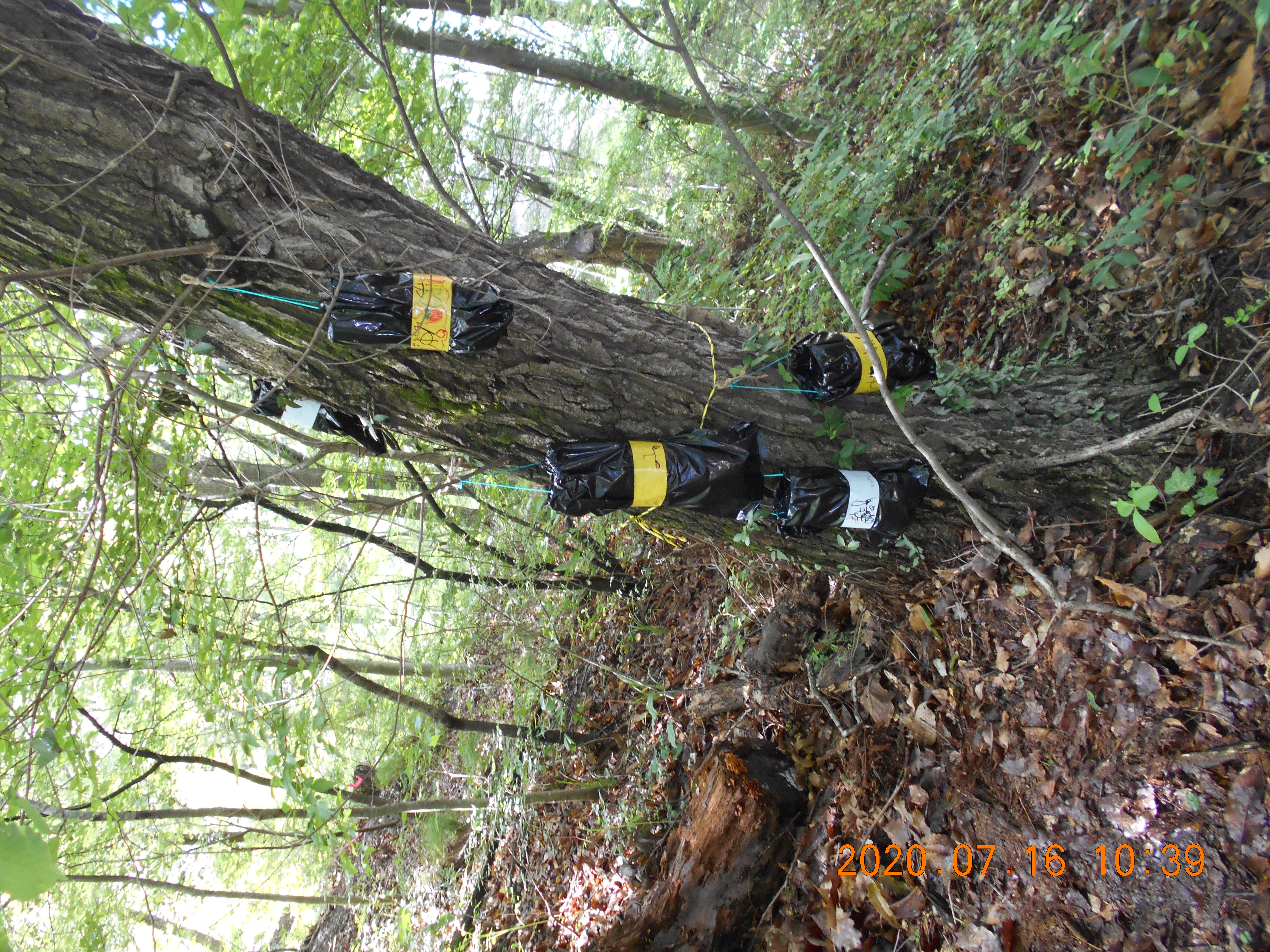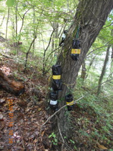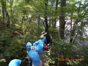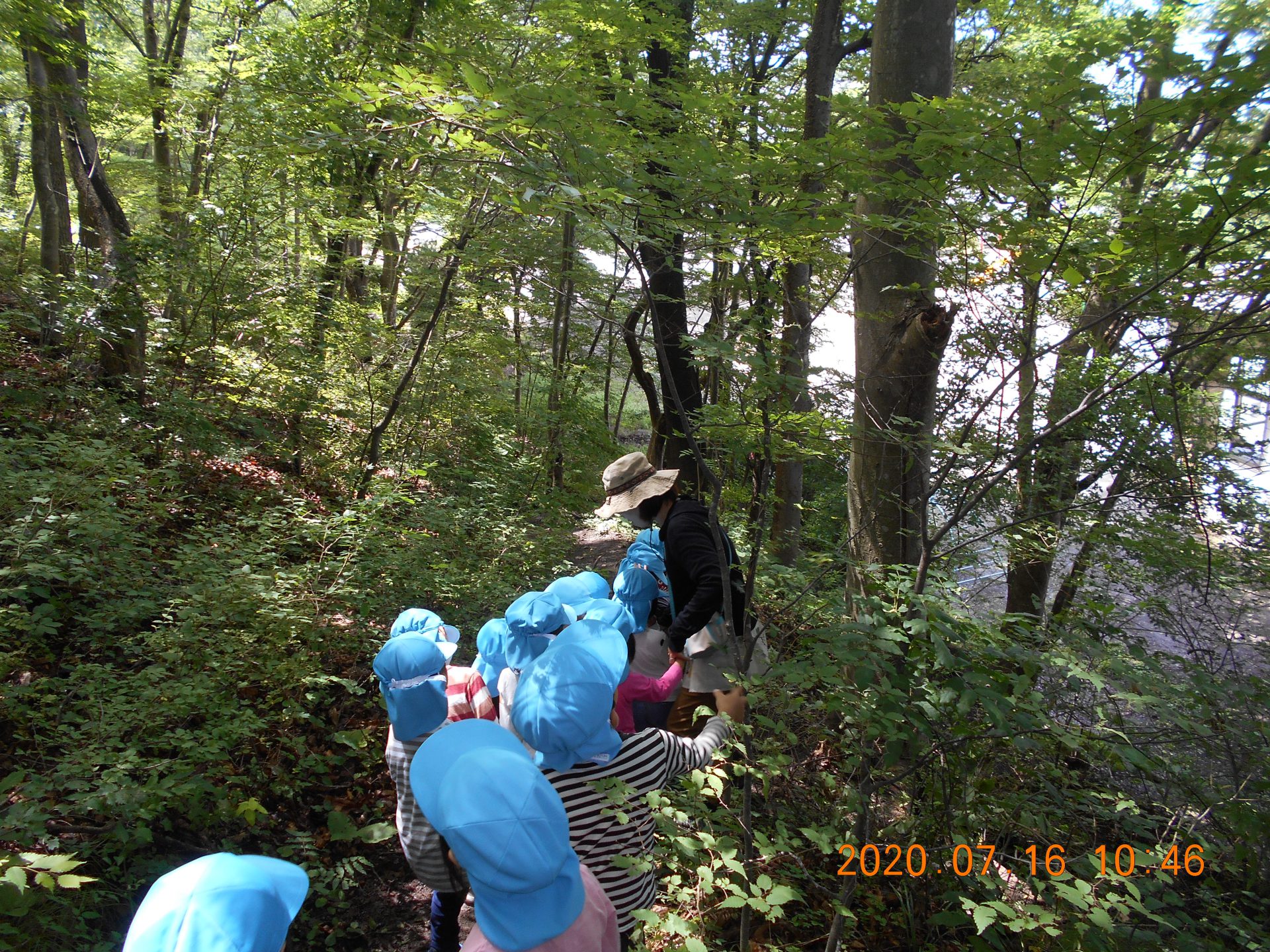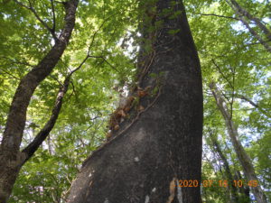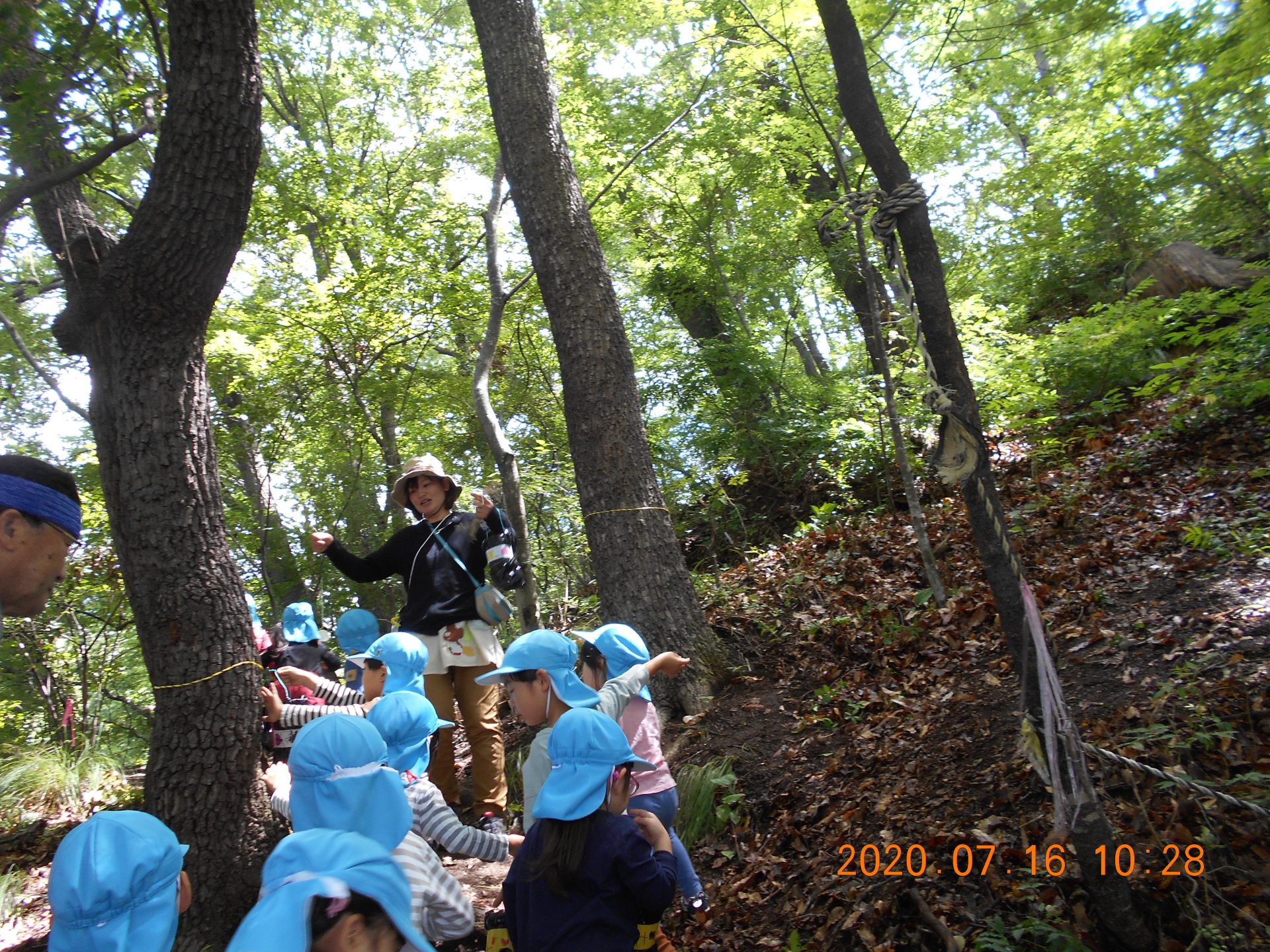 「かぶと虫ってどんぐりの木にいるんだって。」「夜じゃあないと出てこないんだよ。」とお話ししながら、おじいちゃん先生に「ここにしかけて。」とどんぐりの木に結んでもらう女の子。どの木が良いか迷っての決断です。少し薄暗くかぶと虫が来そうな木を選びます。