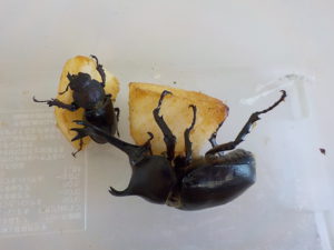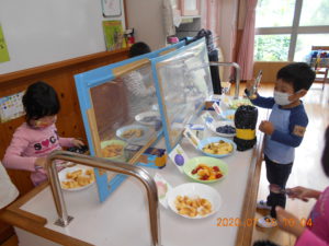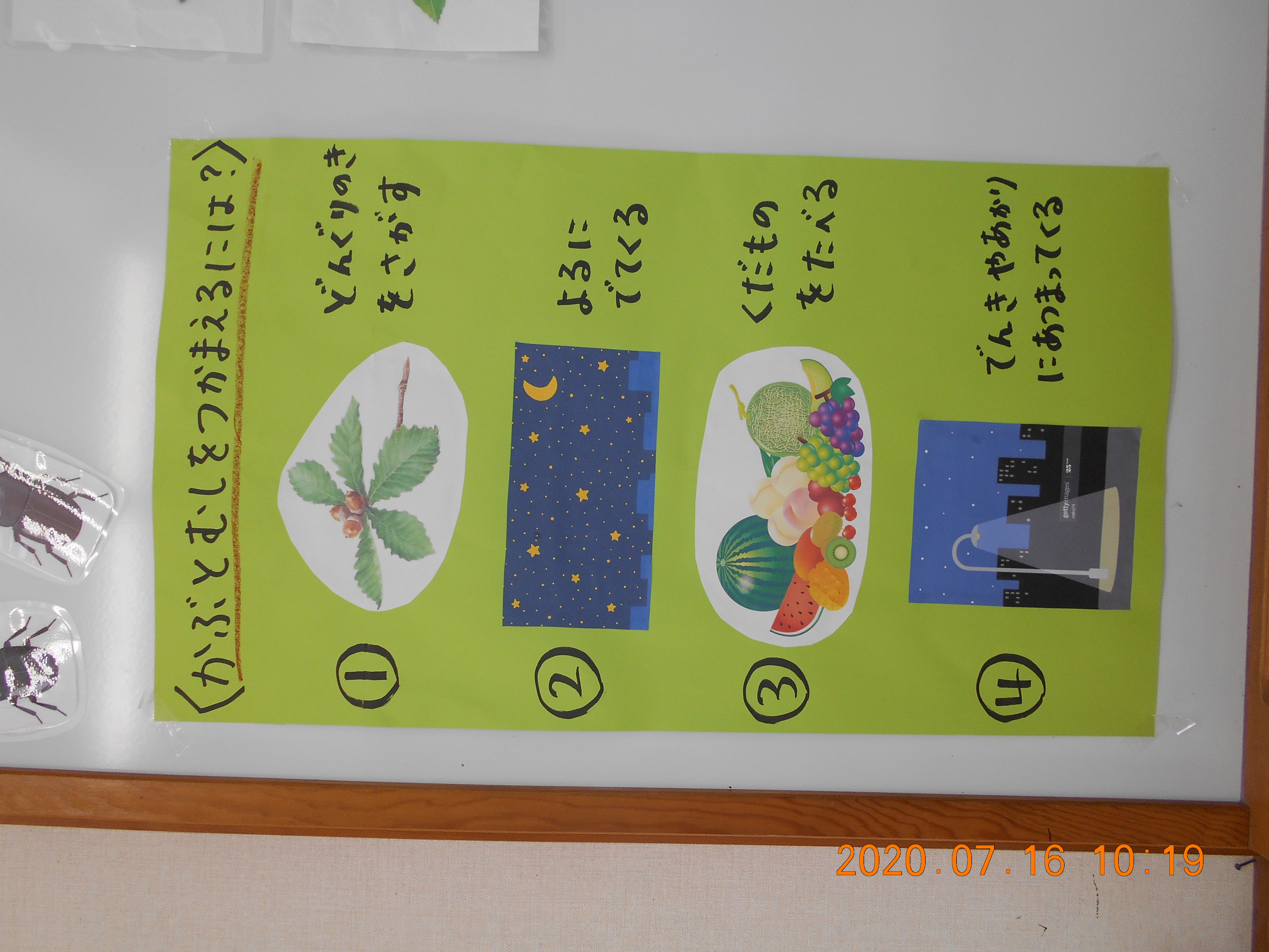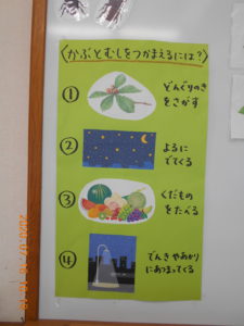 子ども達が図鑑で調べたかぶと虫の好きな食べ物。「スイカは、お腹をこわいちゃうからダメだよ。」「甘い匂いが好きなんだよ。」「どれにしようかな。」じっくり選んでいます。(この果物は、全て担任の家で収穫した果物です。)