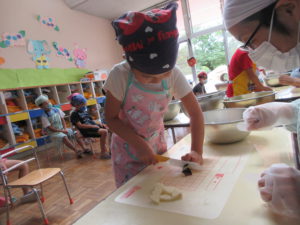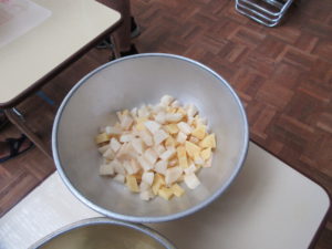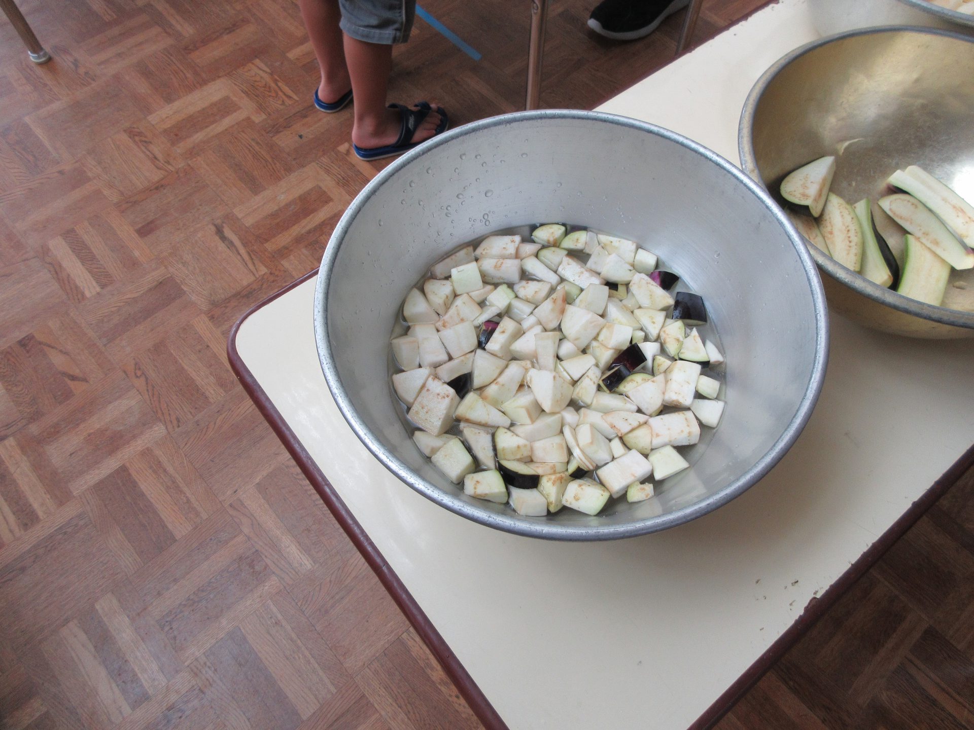 子ども達が切ったナスとジャガイモ。なかなか上手に切れていますね。