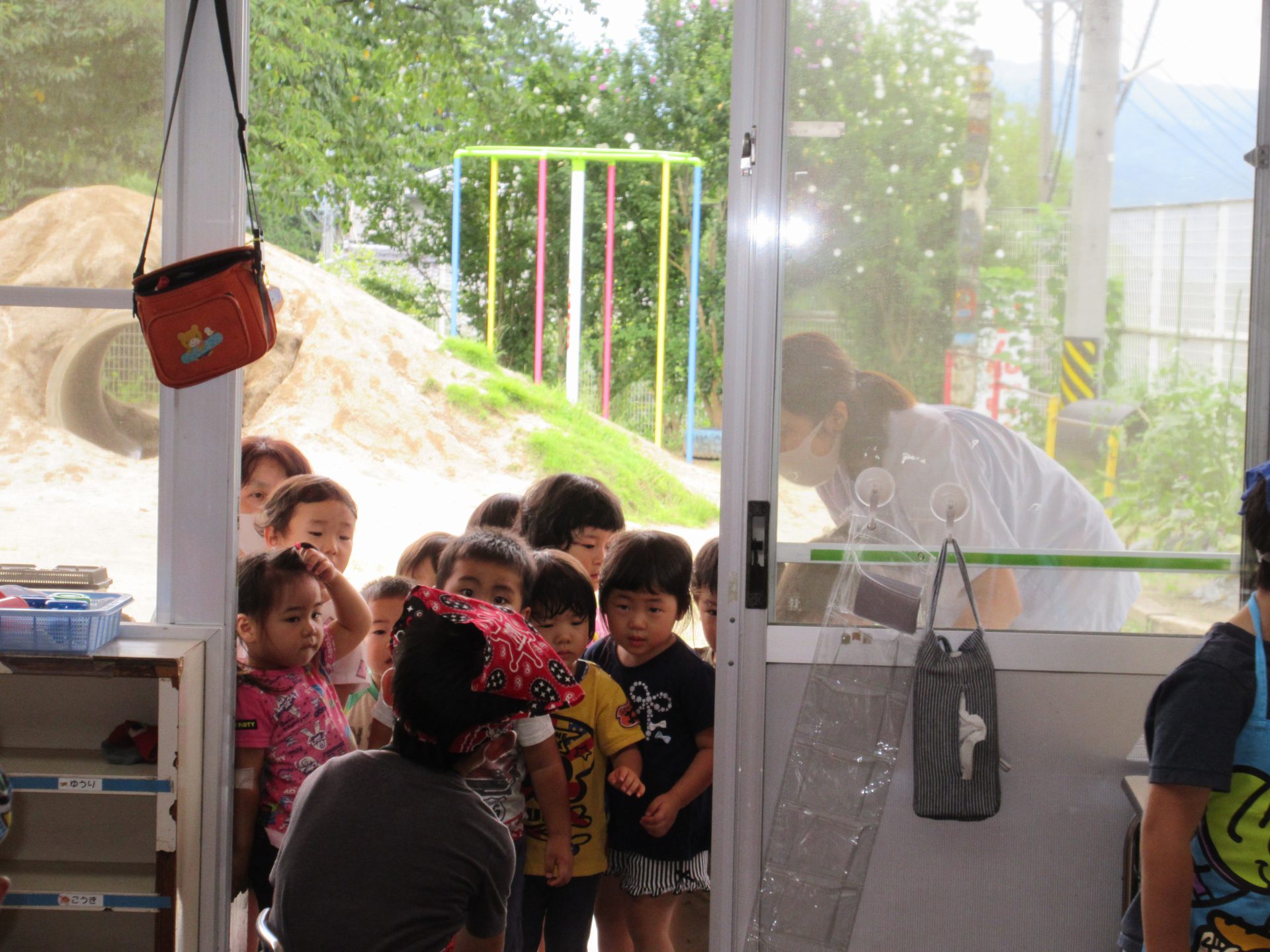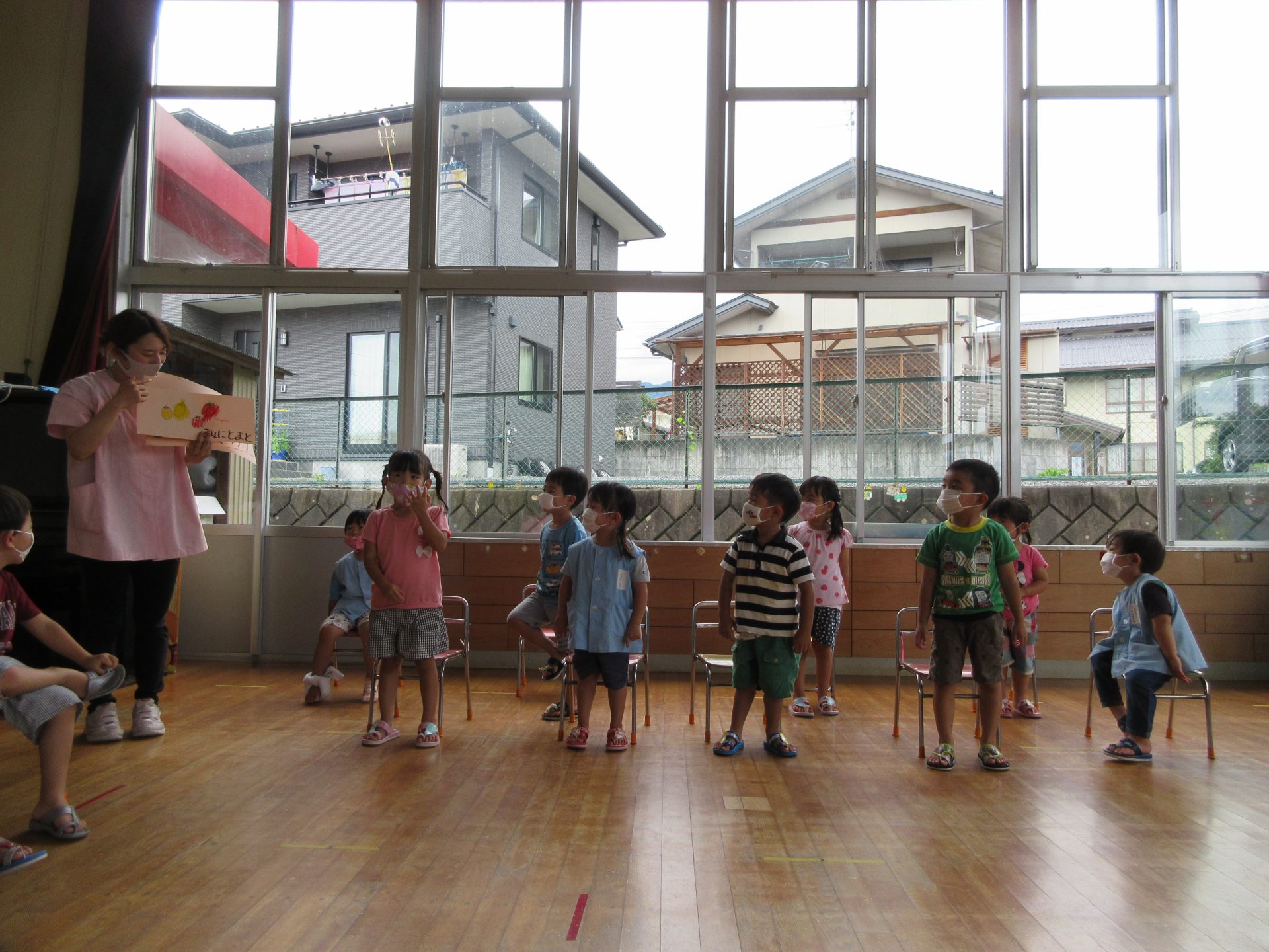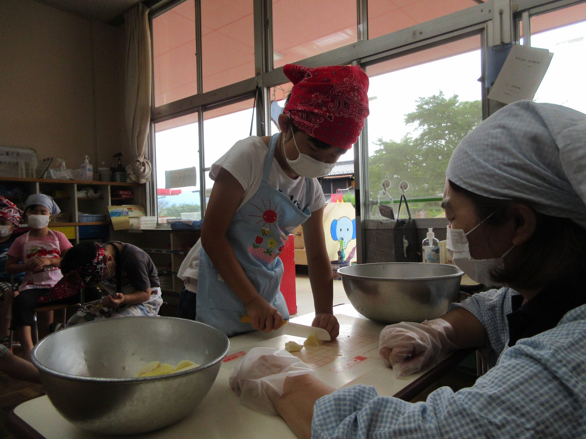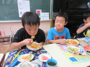 ・今年は雨が続き心配しましたが、保育園の畑ではナス・きゅうり・ジャガイモ・スイカを収穫することができました。例年お世話になっている地域の方やJAの方をお招きして収穫祭を行っていますが、コロナウイルス感染症の拡大が心配されるため、園内のみで行いました。