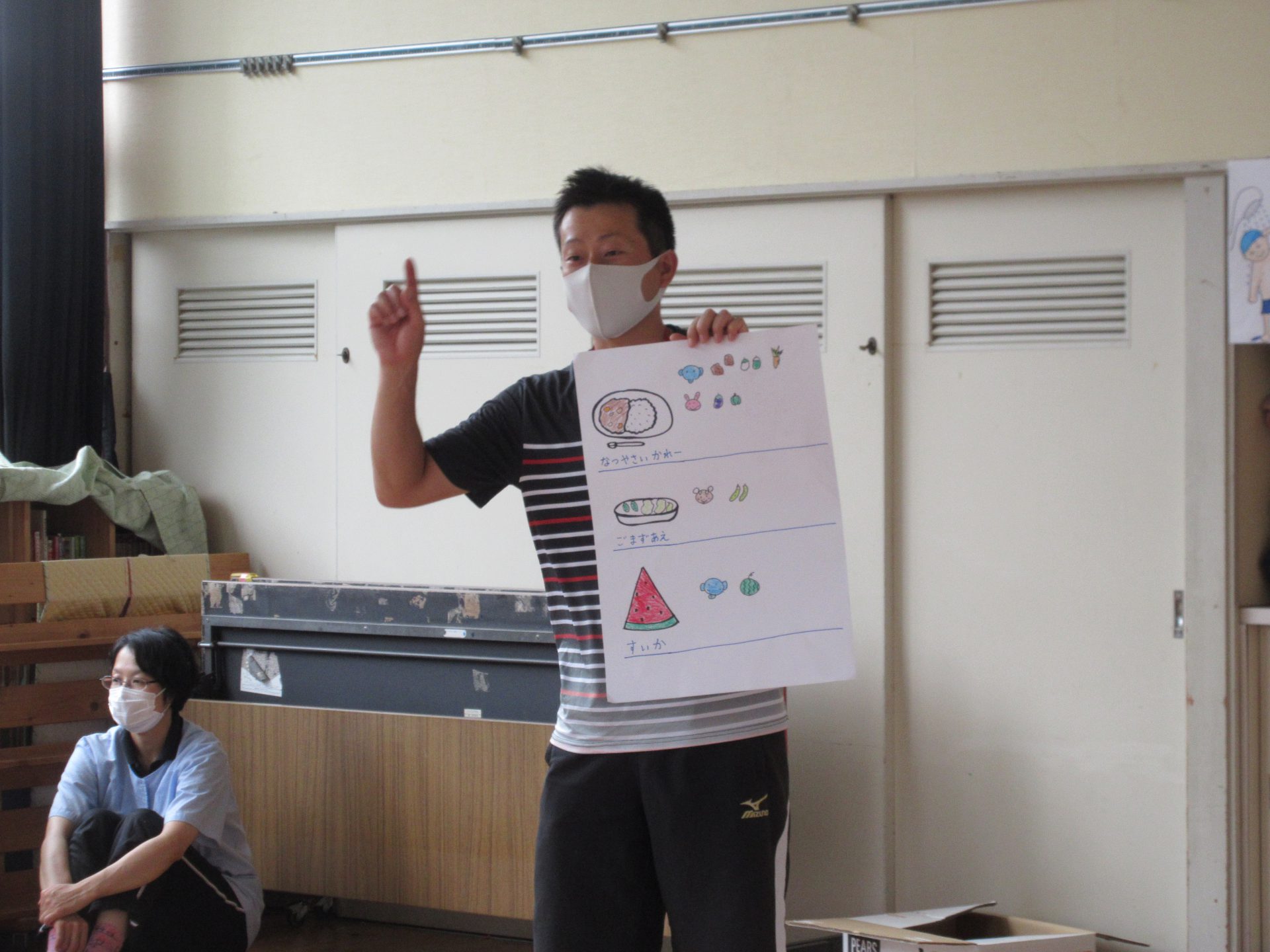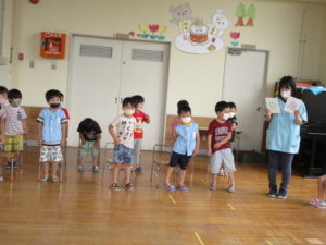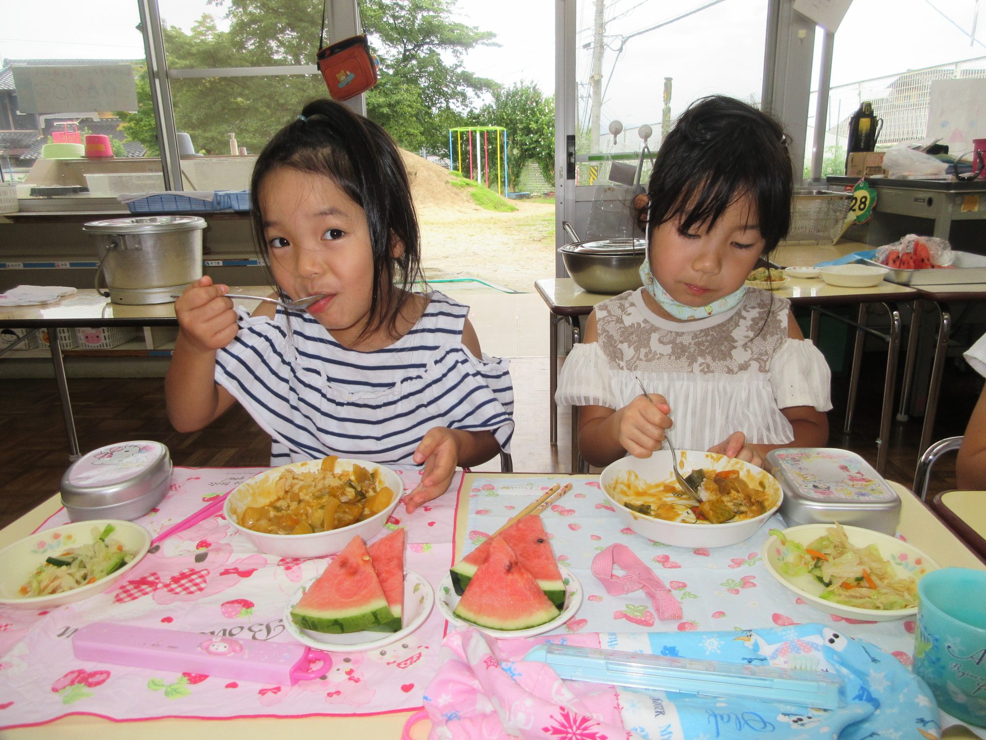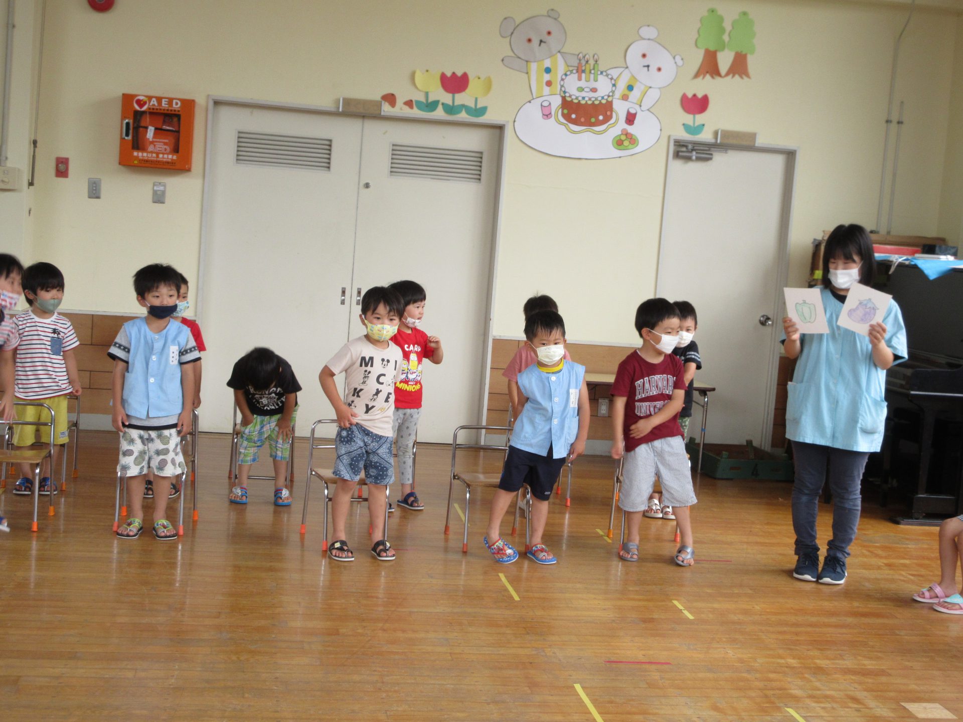 ・今年は雨が続き心配しましたが、保育園の畑ではナス・きゅうり・ジャガイモ・スイカを収穫することができました。例年お世話になっている地域の方やJAの方をお招きして収穫祭を行っていますが、コロナウイルス感染症の拡大が心配されるため、園内のみで行いました。