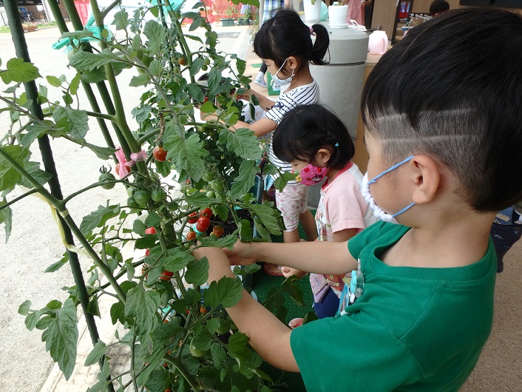 「葉っぱがいっぱいで、赤いトマトを取るのが難しいなあ。」
