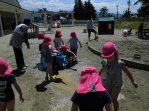 「ほんとだ、あったかい。」「ホースのお水と違うね。」
