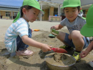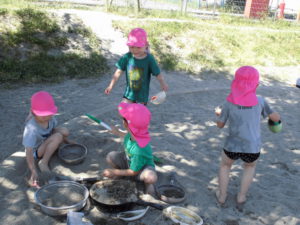友だちと泥を集めて、「お料理作ろうかなー。」