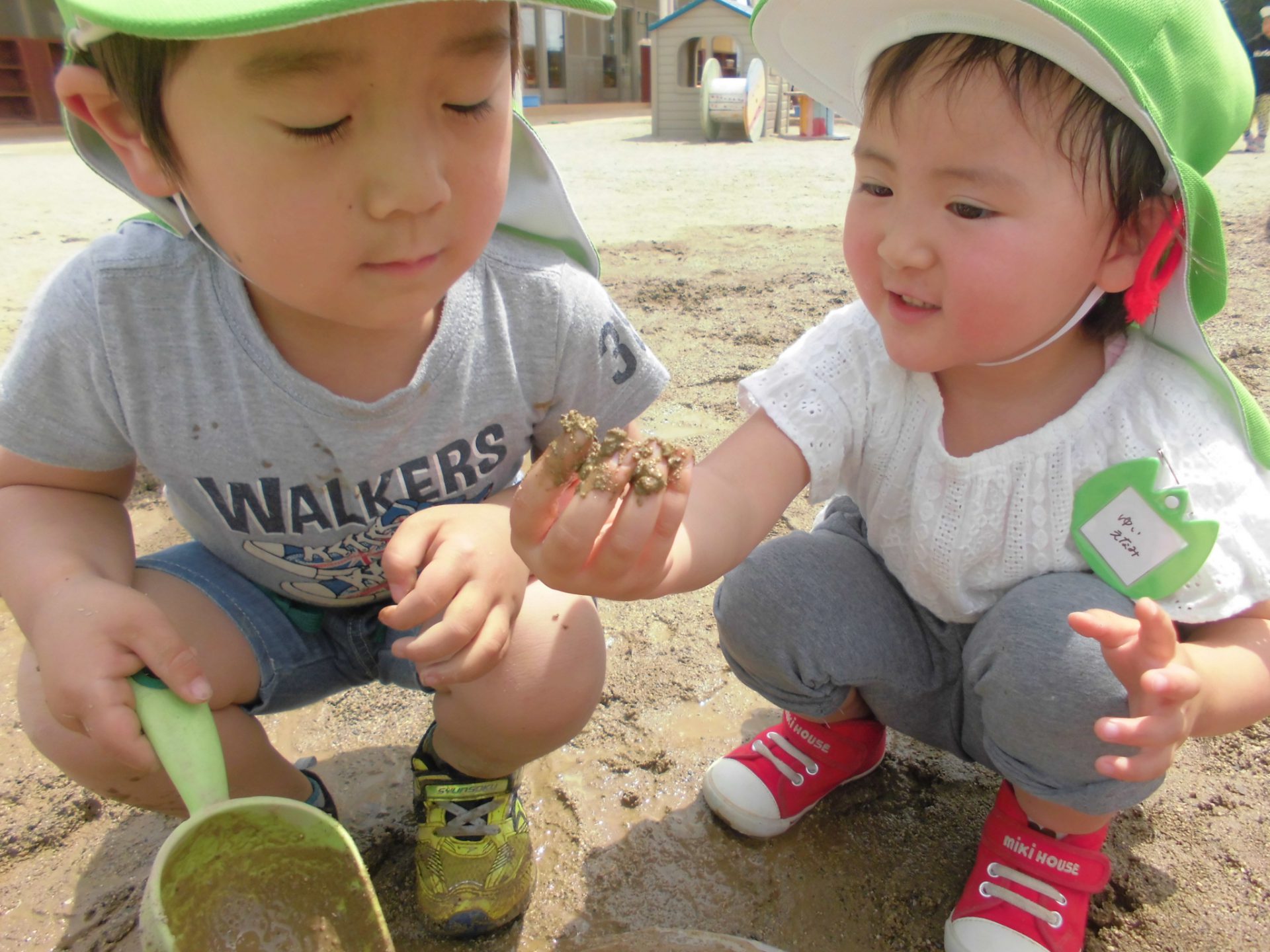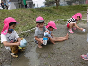はじめは慎重だった年少さんも、泥の感触の面白さに気づくと、段々とダイナミックに全身で楽しむ