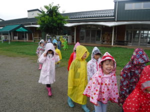 。 「今日も雨降り散歩に出かけられるね」梅雨明け前の最後の雨の日の散歩に子ども達もはしゃいでいます。