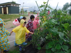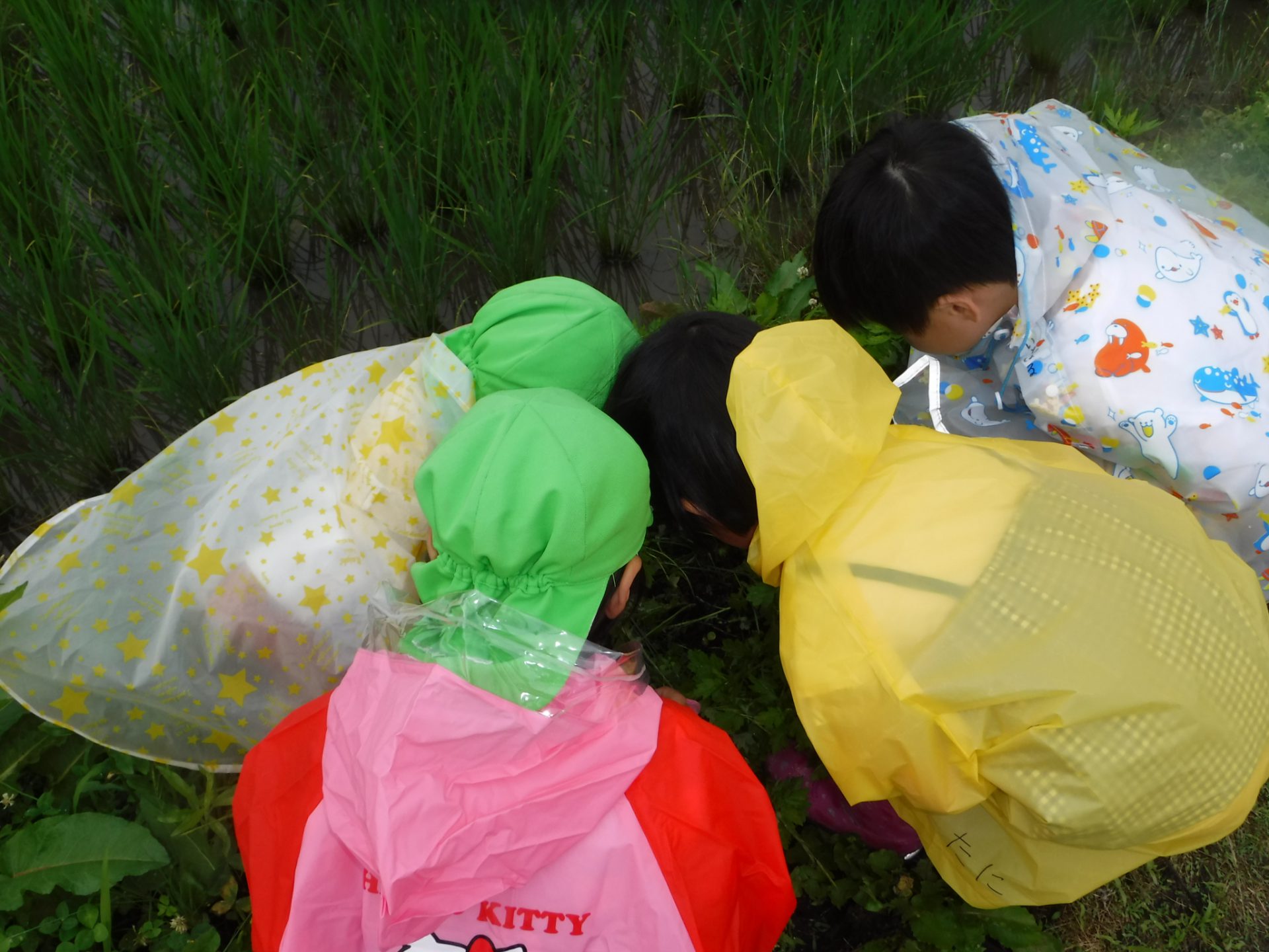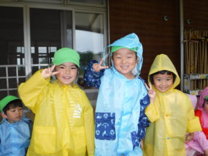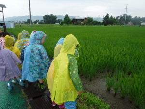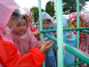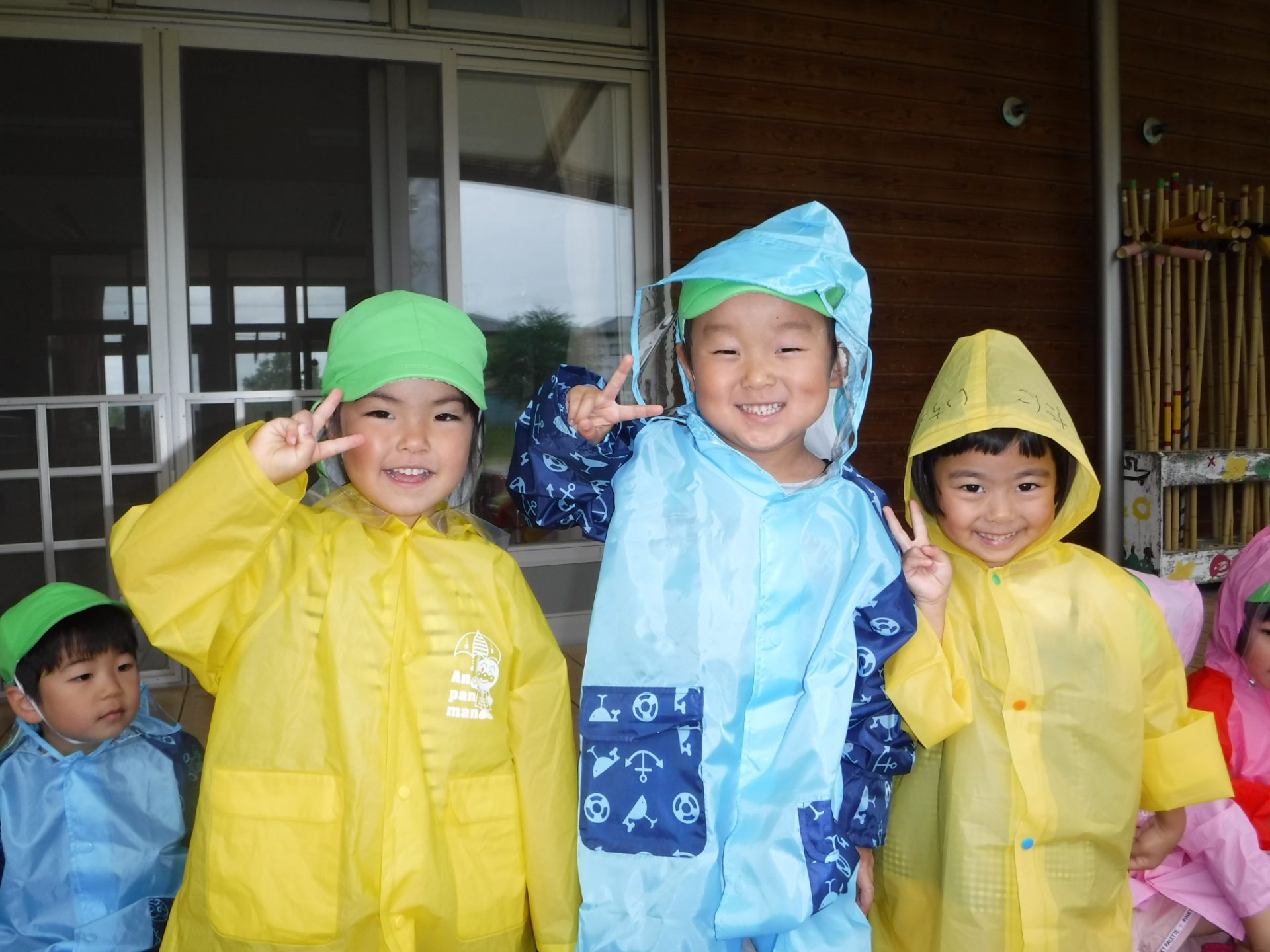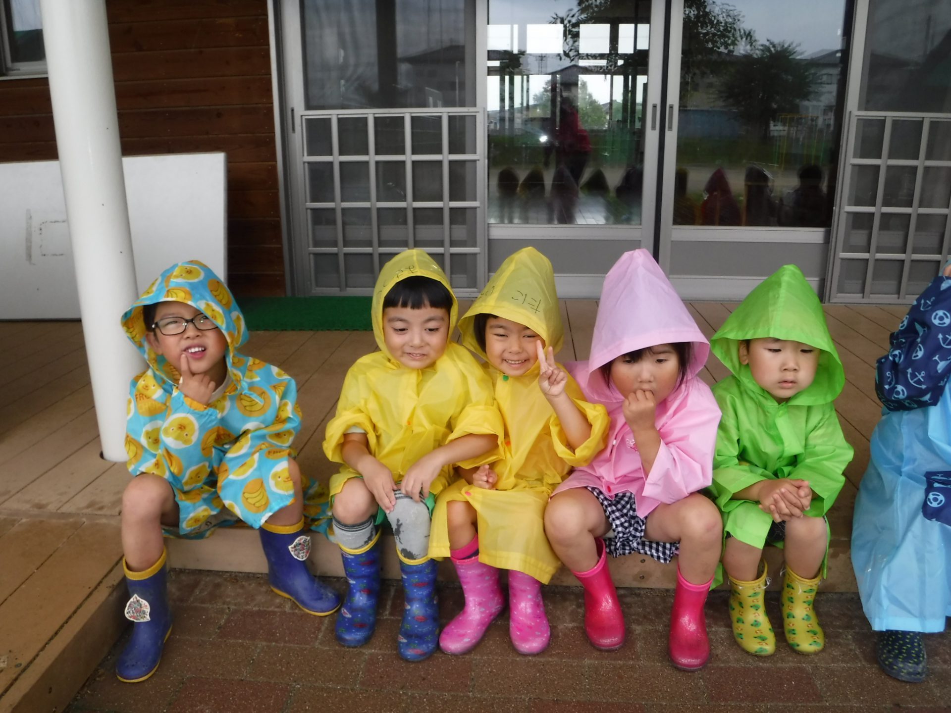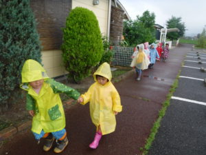。 「今日も雨降り散歩に出かけられるね」梅雨明け前の最後の雨の日の散歩に子ども達もはしゃいでいます。