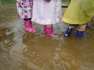 園庭に戻ると「ジャングルジムにも雨がたまってるね」「ここはみずたまりになっているよ」「パシャパシャしてみよう!」と普段とは違う園庭の姿を楽しんでいました。