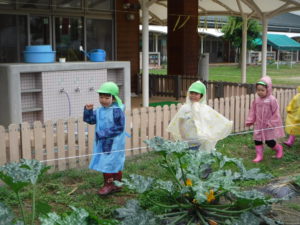 「ズッキーニのオーラムちゃんとダイナーちゃん大きくなったかな」「雨のおみず喜んでるね」