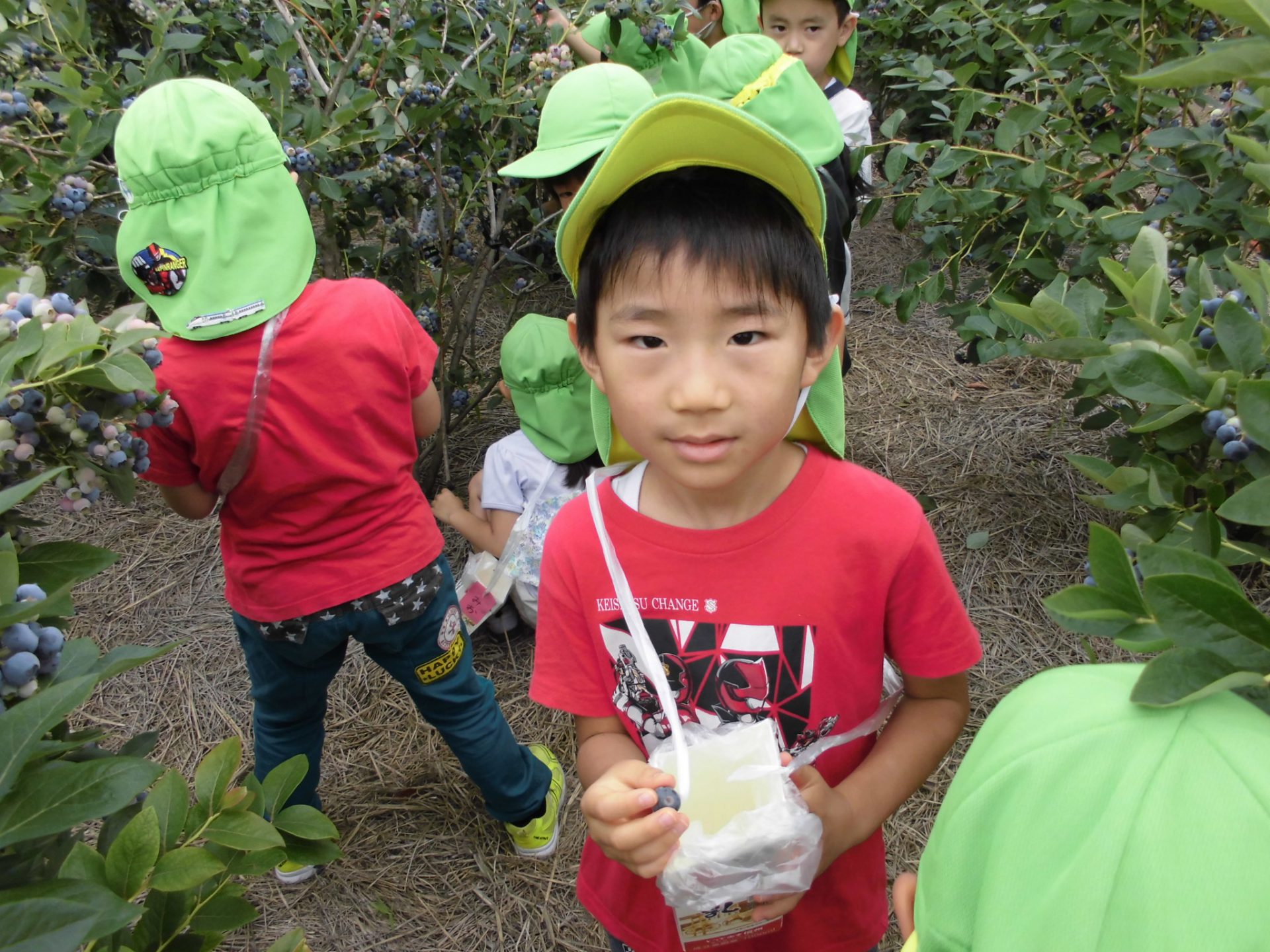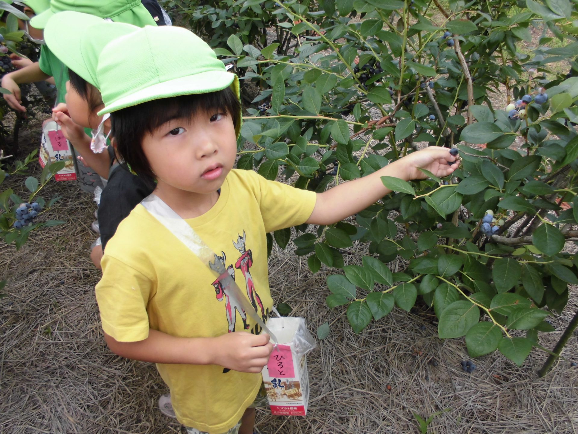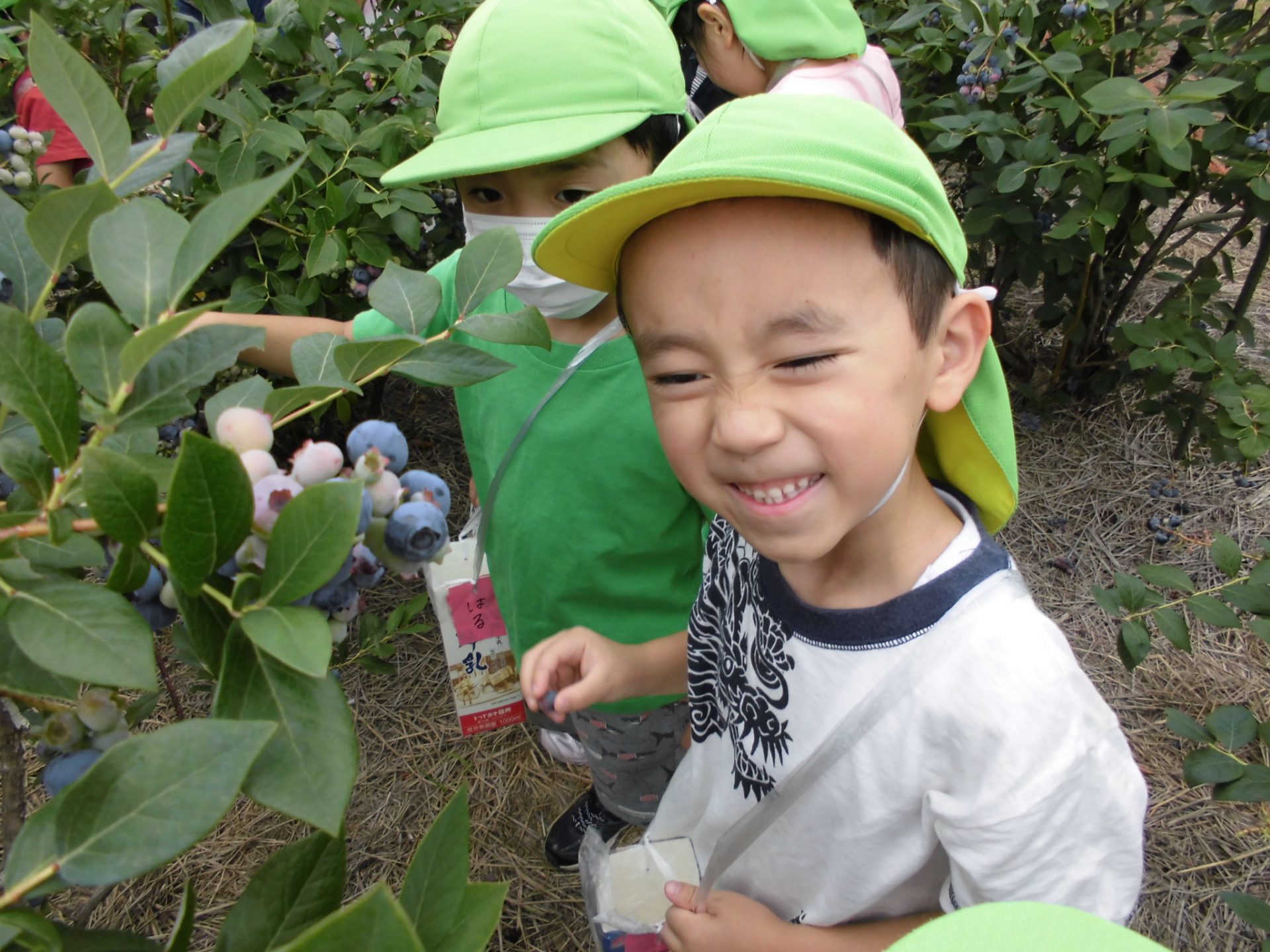 牛乳パックいっぱいにブルーベリーを収穫し、とっても嬉しそうな年長さんでした。