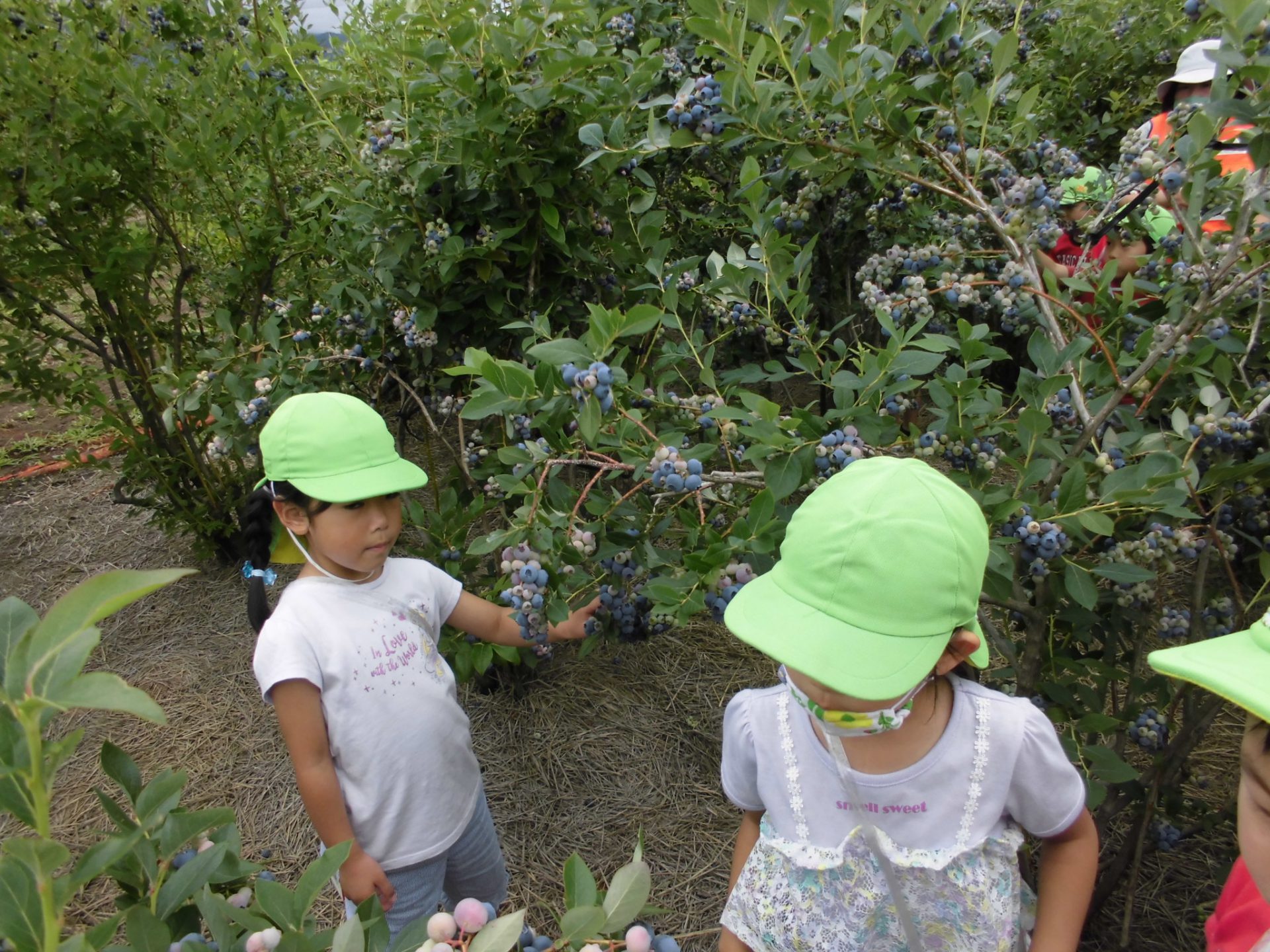 「大きいブルーベリーがたくさんある」とブルーベリーの実の大きさやどんな風に実がなっているかを初めて目にする子たちもいました。