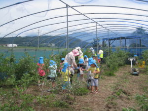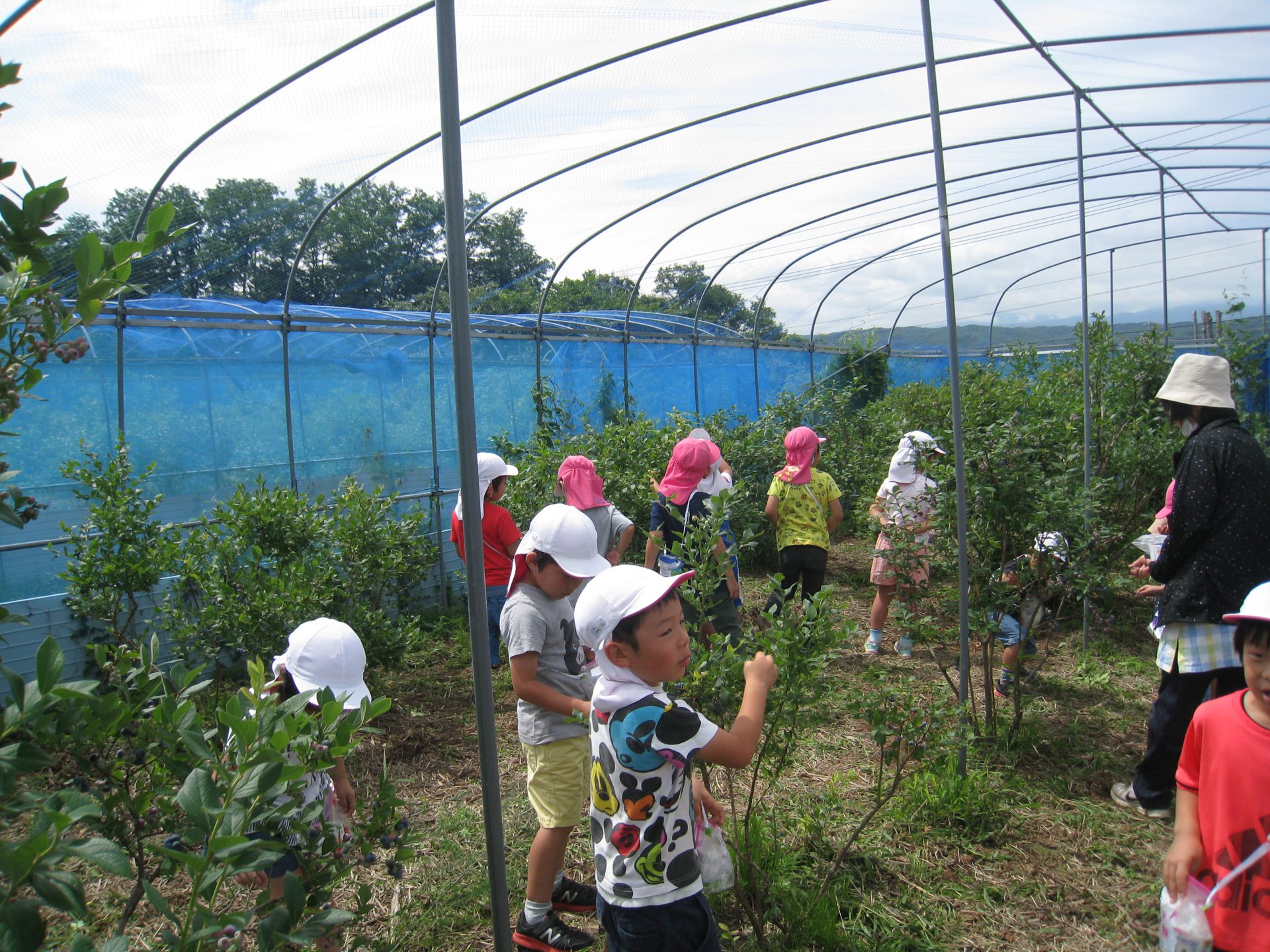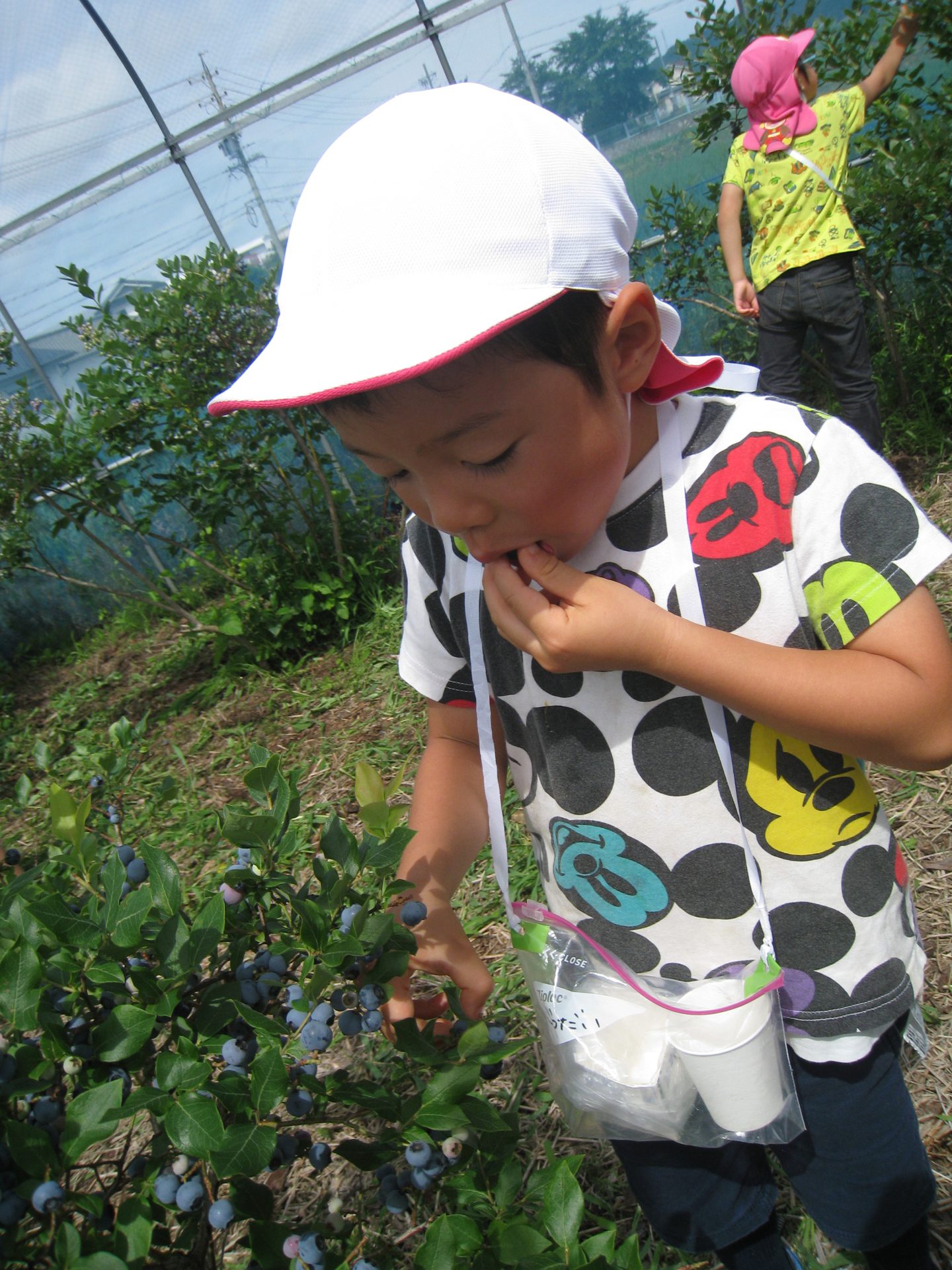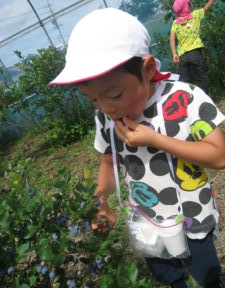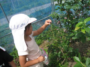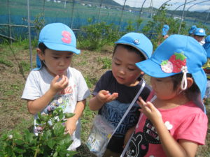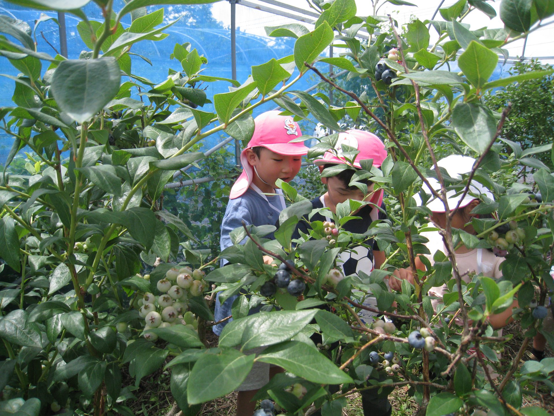 今年は昨年より早くブルーベリーが実り、年長さん、年中さんで行ってきました。