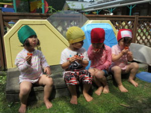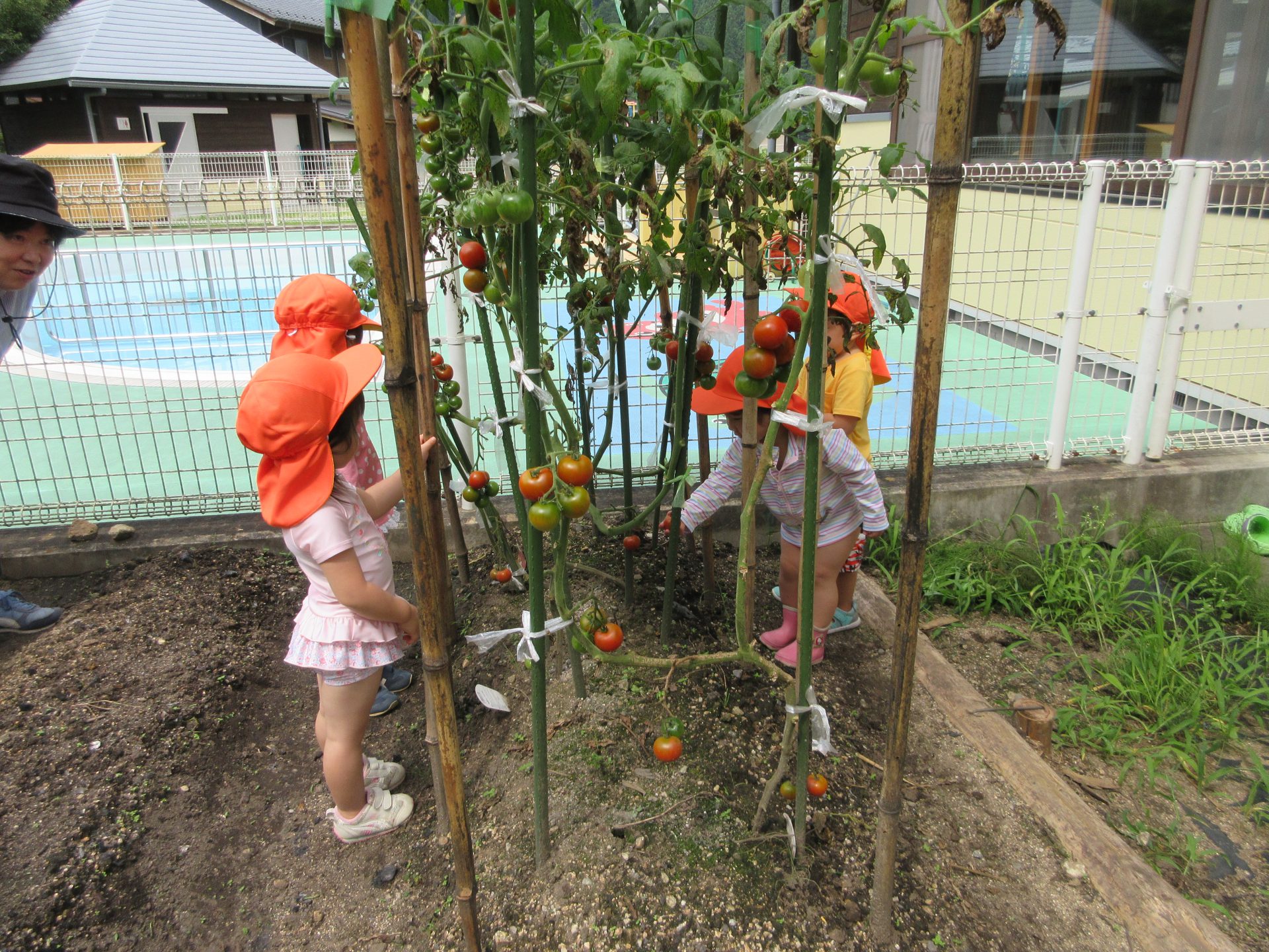 畑は未満児さんの部屋からプール越しに見えるので、年長、年中さんが毎日のように畑に通い、世話をしたり、収穫をしている事が気になっていました。柵の外なので、未満児さんは畑に行く機会が少ないですが、みんなの大好きなトマトだったので、喜んで畑に行きました。「赤いトマト」を自分で選んで引っ張って収穫していました。未満児さんだけで採れたてトマトを食べたのが嬉しそうでした。