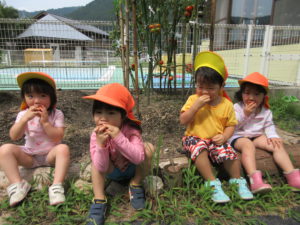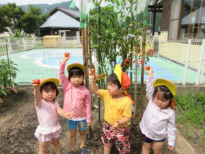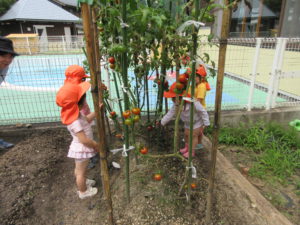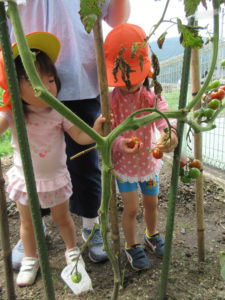 畑活動は以上児さんが中心に行っています。今年は新しくプール横にも畑ができて、色々な野菜を毎日のように世話して菜園活動に取り組んでいます。そんな姿をみているので自分達で育てるのはまだ難しいですが、おすそわけをいただいた事から、未満児(2歳児)さんの大好きなトマトなら関心を持てるのではと思い、年長・年中さんにお願いしました。なっているトマトの観察よりも食べたい気持ちが大きかったですが、採れたて新鮮なトマトを味わう事ができました。その後も毎日「緑のトマトは酸っぱいんだよね」「トマトおいしかったね」と印象に残ったようです。また「黄色いトマトは?」という声も上がっているので、来年の菜園活動に取り入れていきたいと思います。