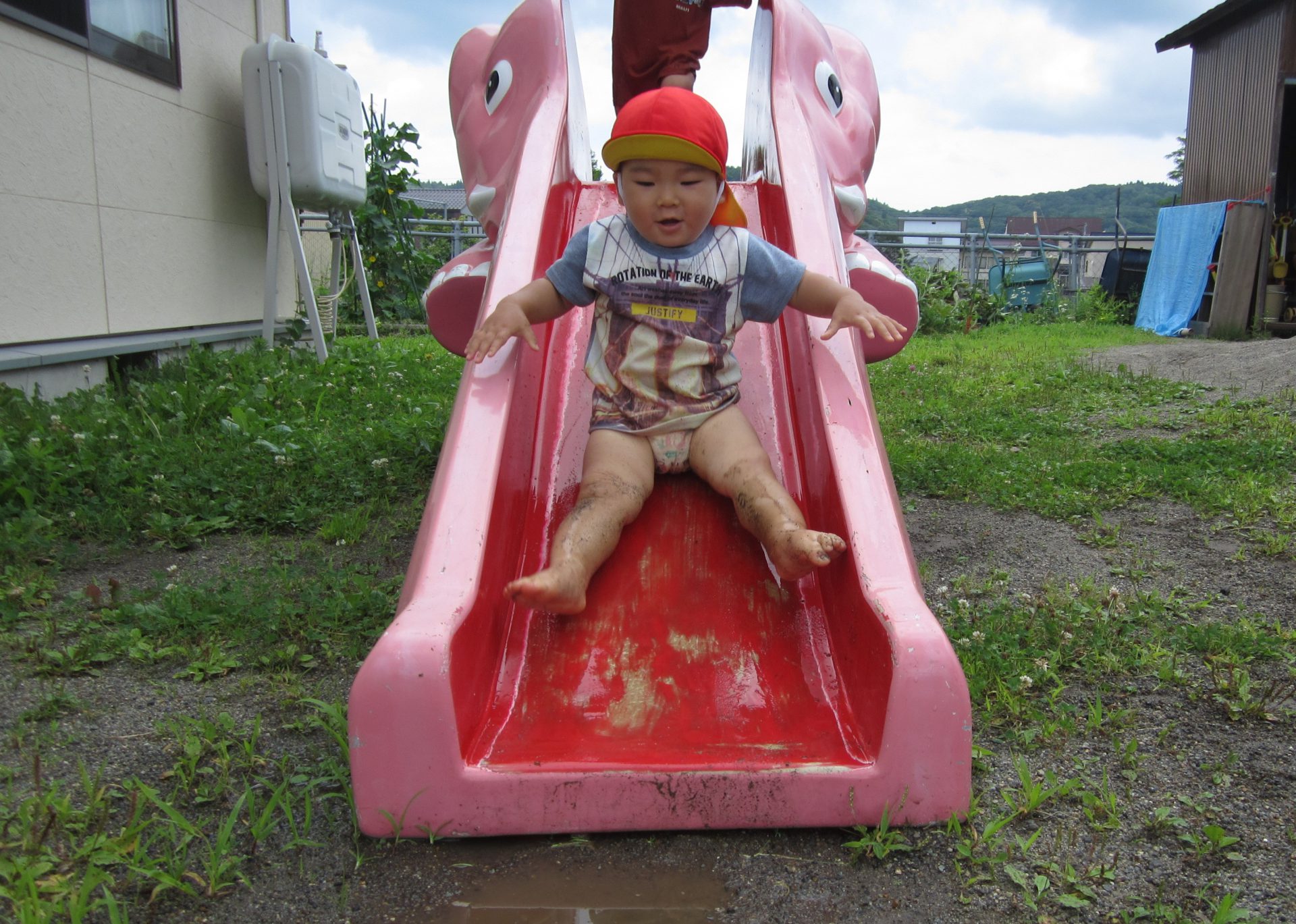 暑そうね、とぞうさんにも水をかけていたら、滑り台が滑りやすくなり、ちょっとしたウォータースライダーになりました。