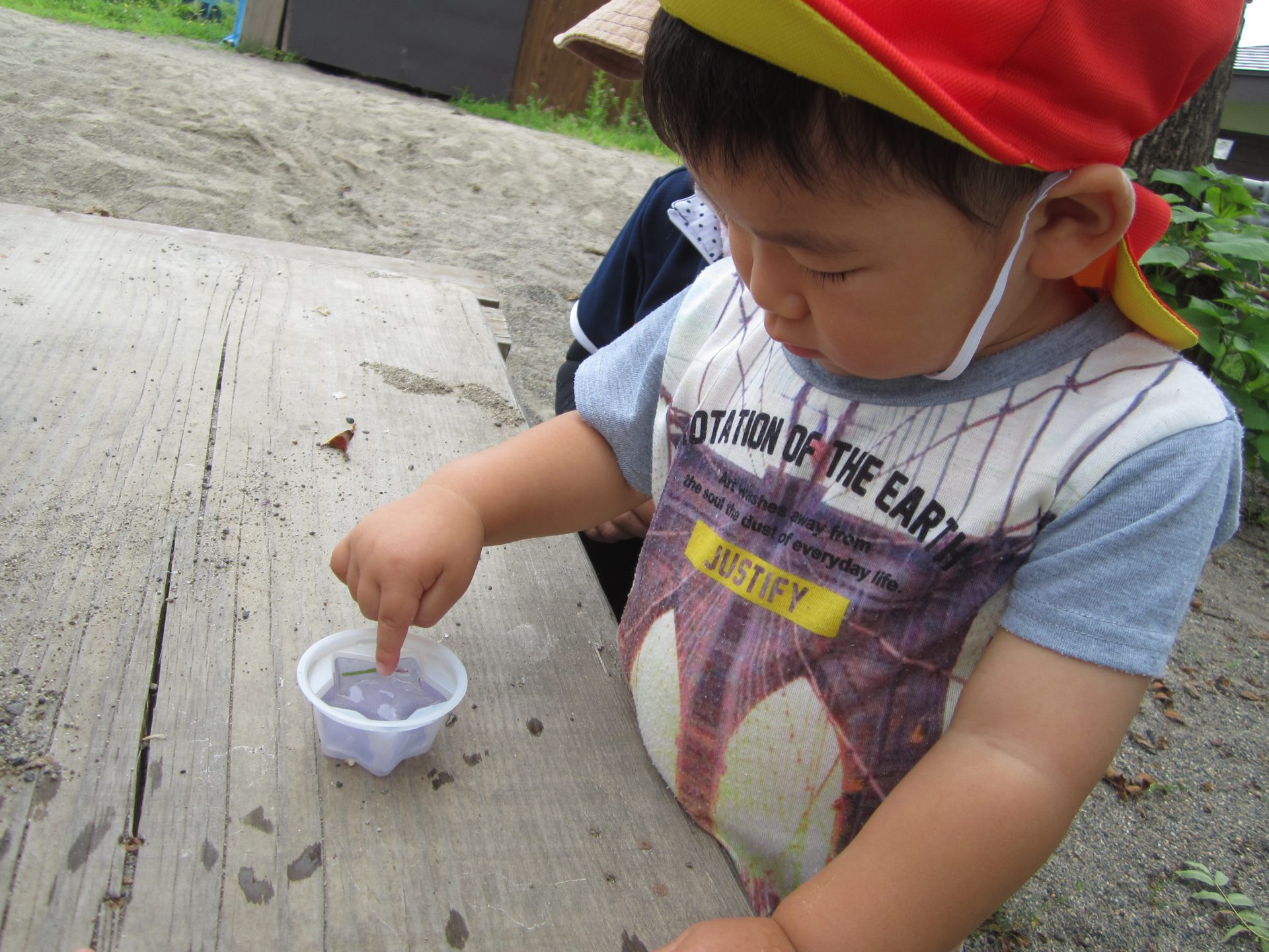 一緒に色水を作っていて3歳児のお友だちに「草はどう?」と提案され、草と水を混ぜてみました。