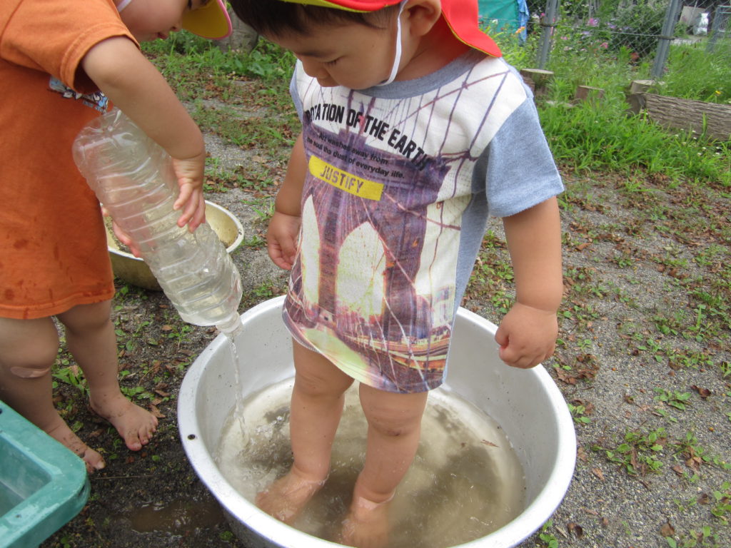 水の冷たさを感じて、気持ち良かったのか、しばらく浸かっていました。(その様子を見て2歳児のお友だちが水をかけに来てくれました。優しいお兄さんです)