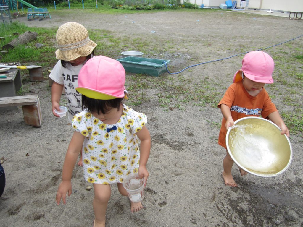 みんなで入れるくらい大きなプールをつくりたいね、という話をしていると「つくってみたい!」とそれぞれ水を汲む容器を選び運んできてくれました。