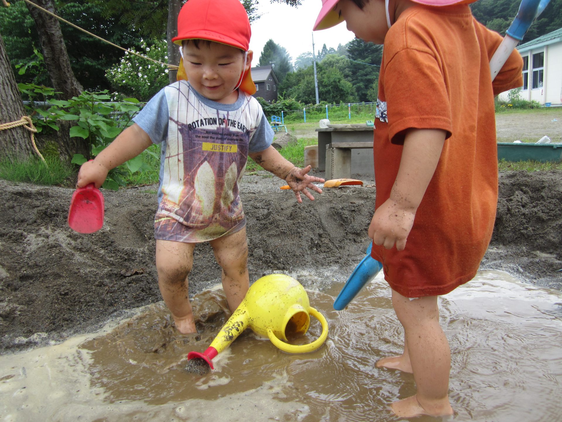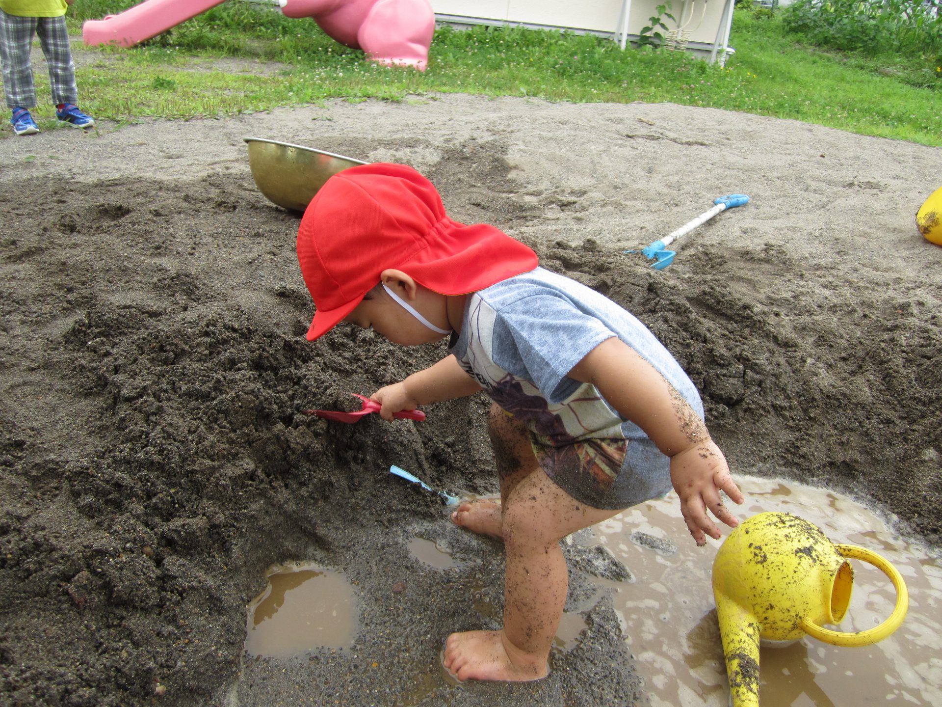 未満児クラスでは、8月に入ってからどろんこ遊びのなかで水、泥など自然のものに触れ合って楽しんでいます。今回はその様子をご紹介!
