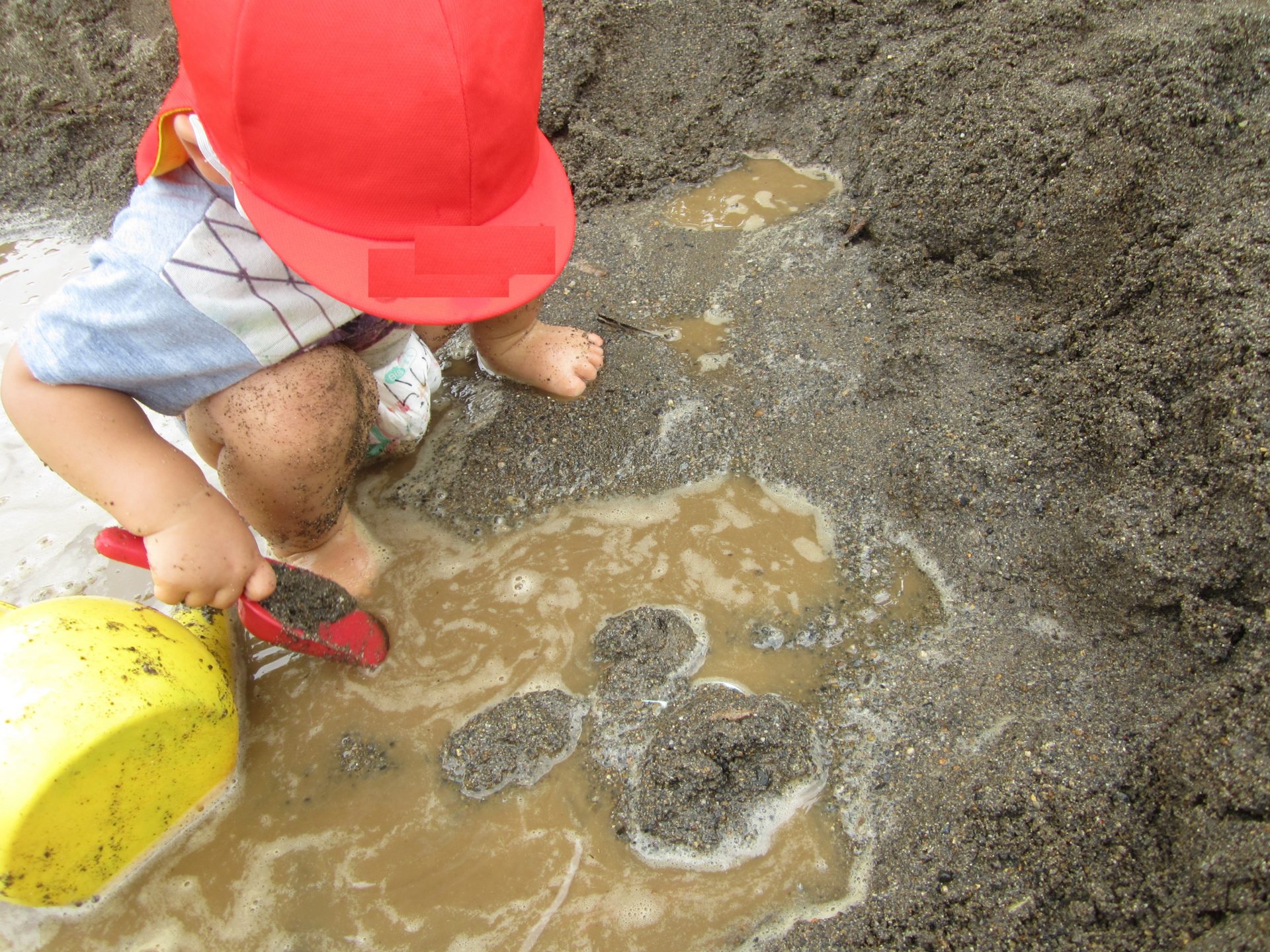 水を入れることで、水たまりができ、土が見えなくなったことが不思議だったようで、土を水たまりの中に入れてみていたのでした。