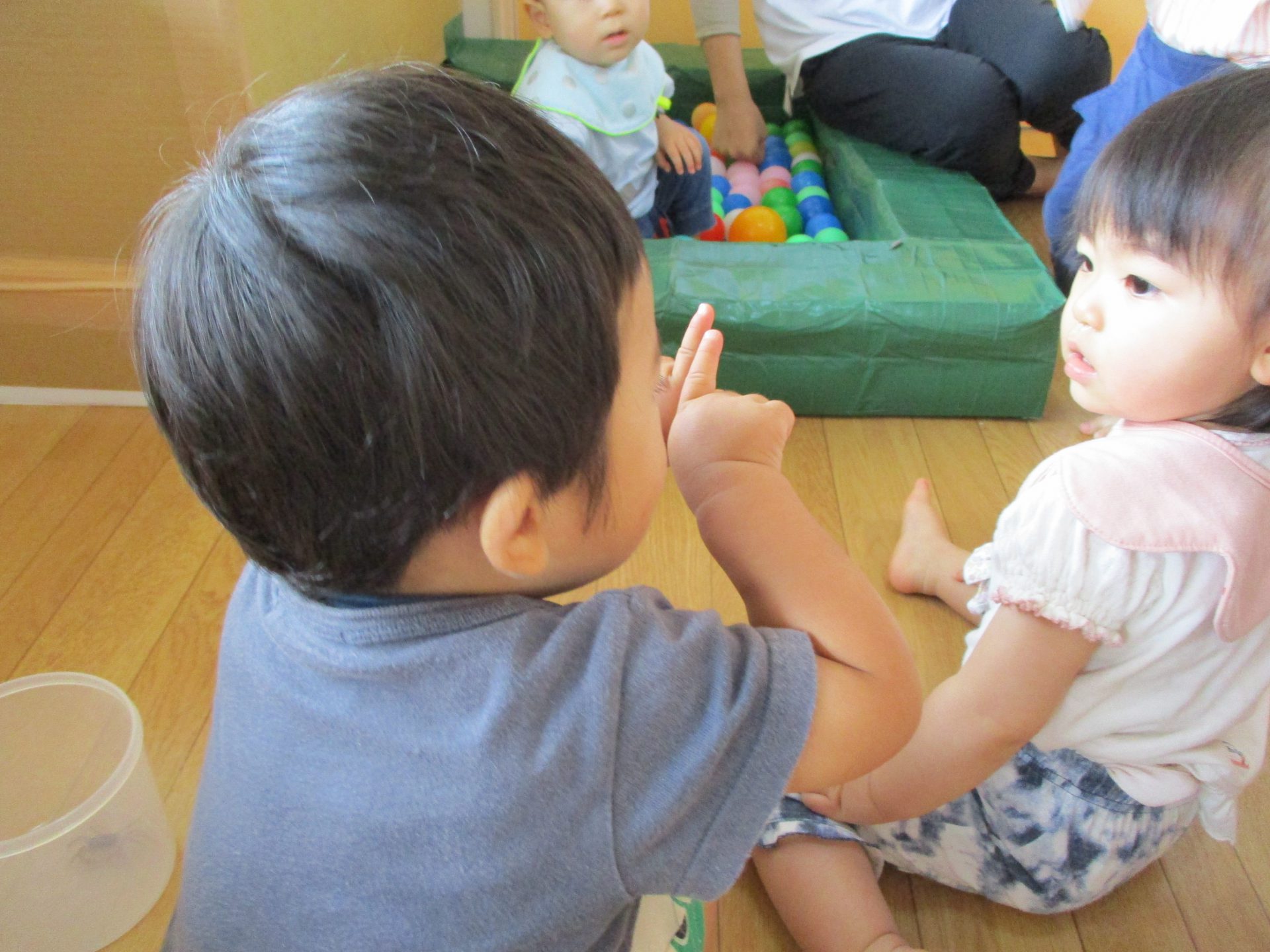 発見後は、ボールプールの中からカニさん?と驚いたようで、子どもたちは不思議そうにサワガニを見つめていました。