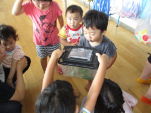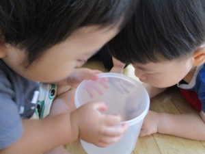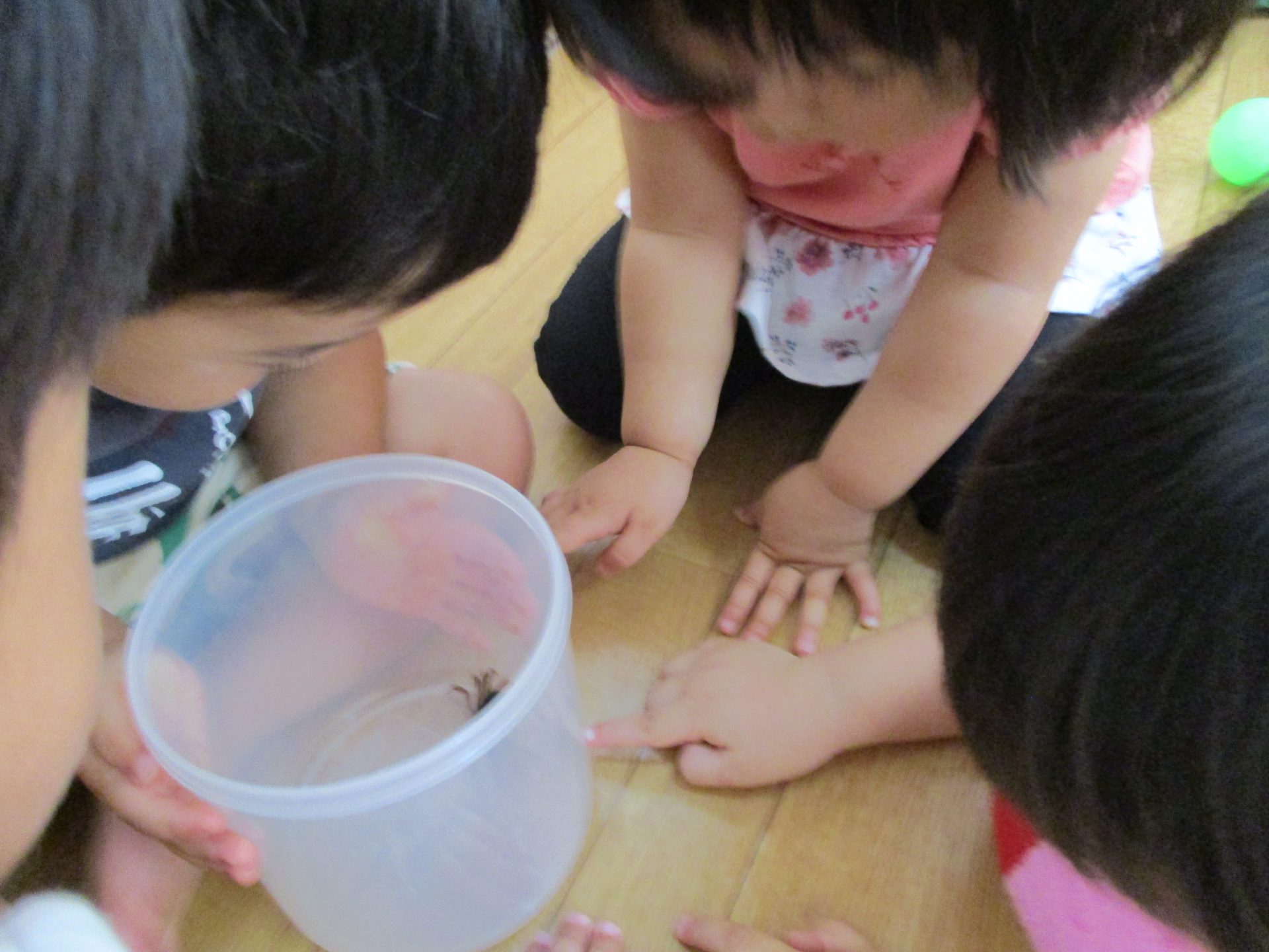 保育士が透明な容器にサワガニを入れると、上から、下から、横から、様々な方向からサワガニを観察していました。下から見てみると、自分の普段見ているカニとは違い、ビックリしたのでしょうか。「うわ」という表情をする子も。