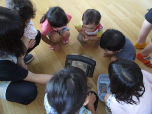 年中さんのお部屋に行った後は、ピョンピョンとジャンプしたり(カエル)、人差し指同士を合わせてコツコツと言ったり(カブトムシが喧嘩している様子)、ニョロニョロと言いながら手を動かしたり(カナヘビ)する様子もありました。